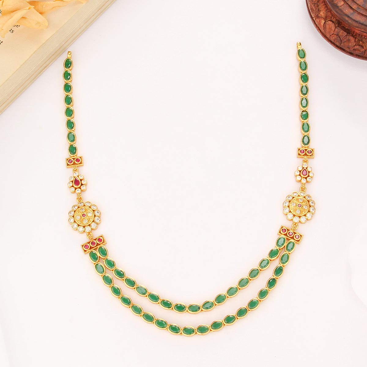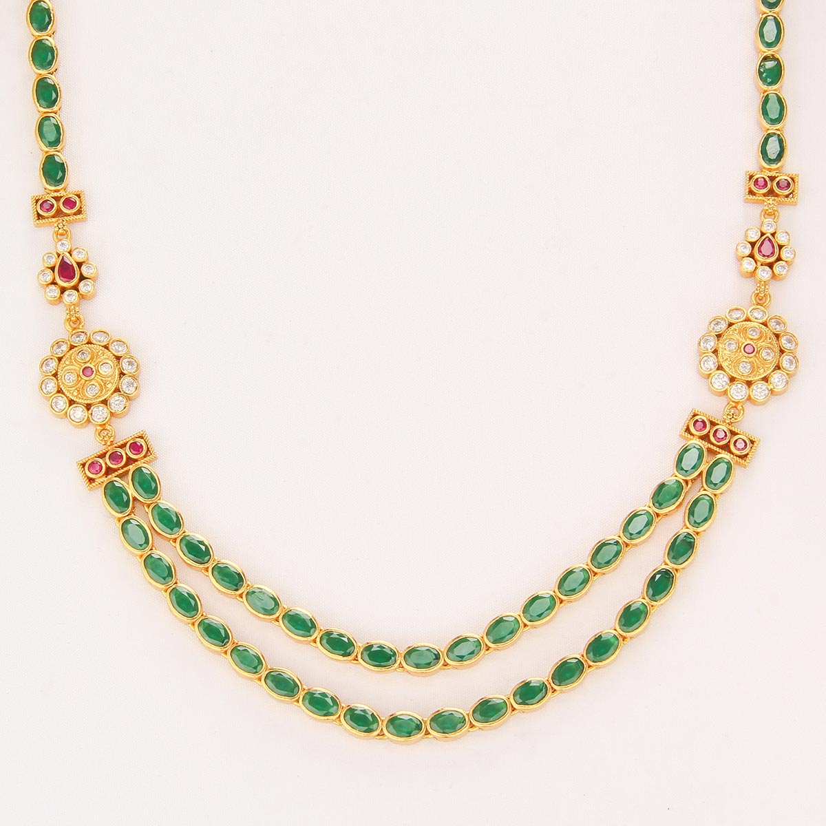 This 92.5 Silver, 24 kt gold-plated, stylish Necklace is studded with semi-precious stones to make a stunning statement. Perfect for any special occasion.