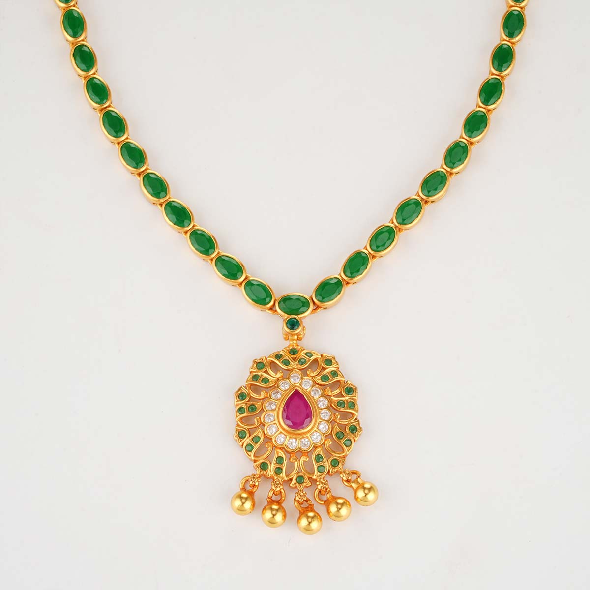 This 92.5 Silver, 24 kt gold-plated, stylish Necklace is studded with semi-precious stones to make a stunning statement. Perfect for any special occasion.
