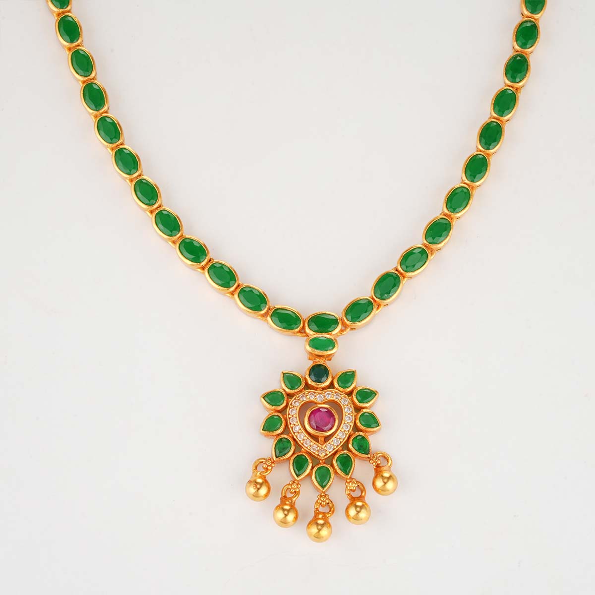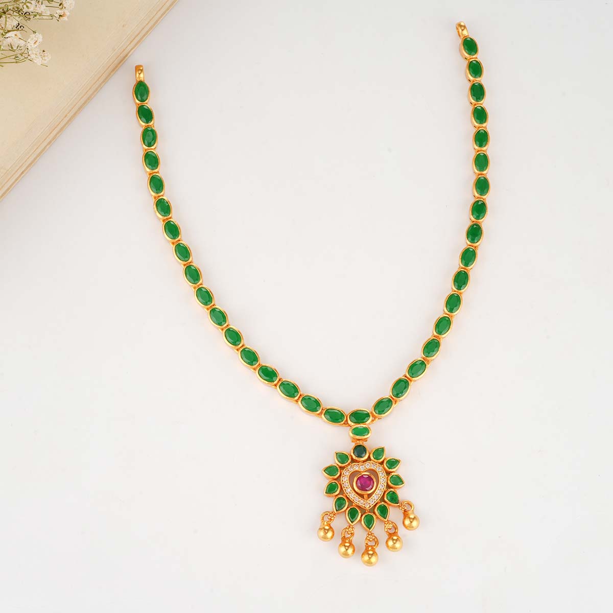 This 92.5 Silver, 24 kt gold-plated, stylish Necklace is studded with semi-precious stones to make a stunning statement. Perfect for any special occasion.