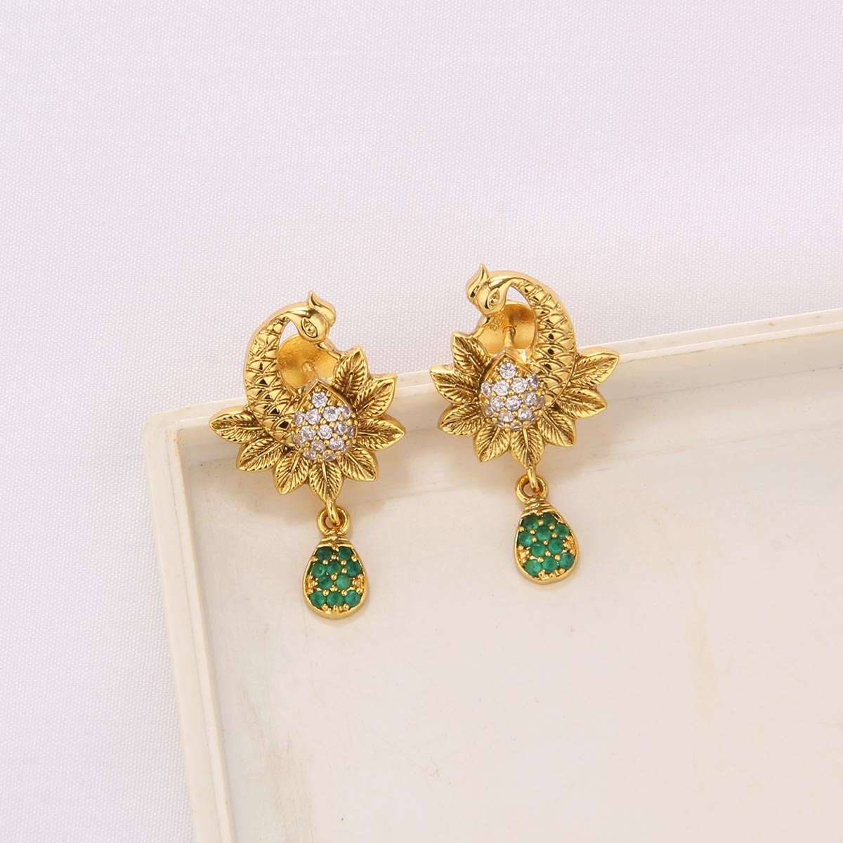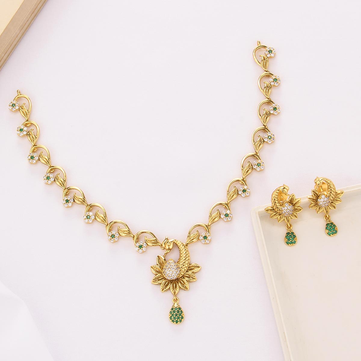 This necklace set is crafted from 92.5 Sterling Silver and features 24-karat gold plating and semiprecious stones.