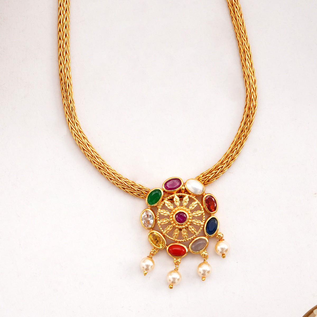 - The necklace is studded with Semi-precious stones.