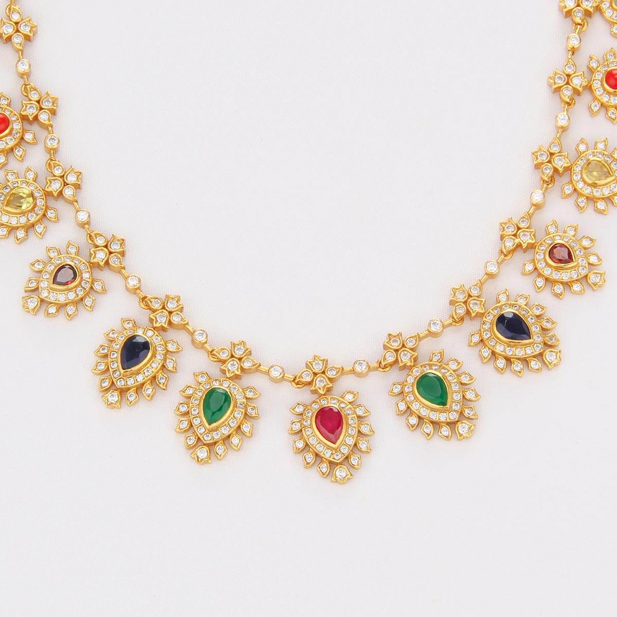 This 92.5 Silver, 24 kt gold-plated, stylish Necklace is studded with semi-precious stones to make a stunning statement. Perfect for any special occasion.