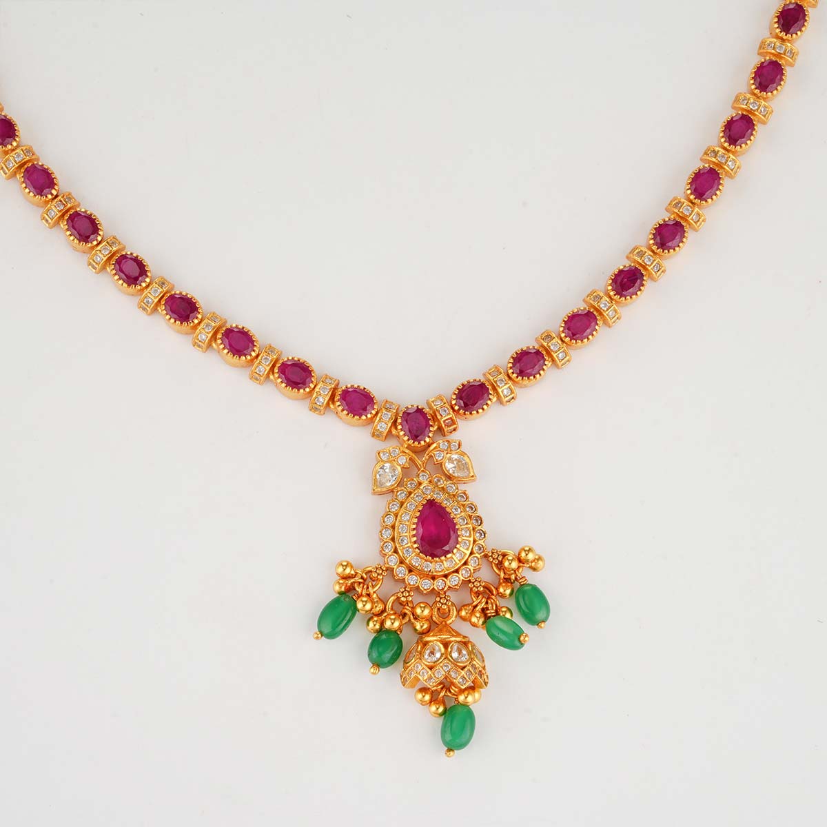 This 92.5 Silver, 24 kt gold-plated, stylish Necklace is studded with semi-precious stones to make a stunning statement. Perfect for any special occasion.
