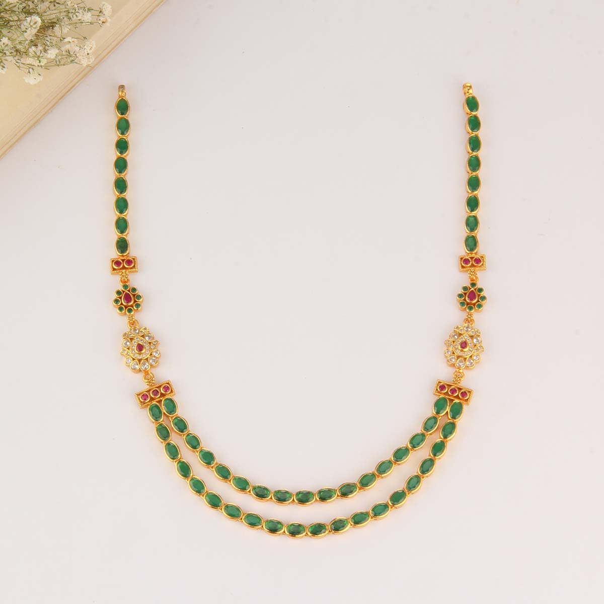 This 92.5 Silver, 24 kt gold-plated, stylish Necklace is studded with semi-precious stones to make a stunning statement. Perfect for any special occasion.