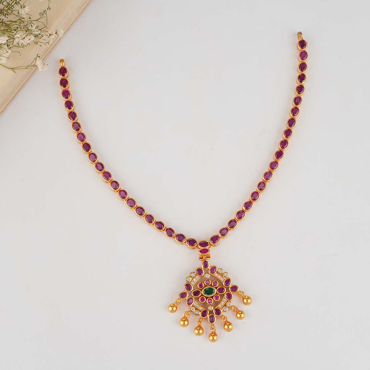 This 92.5 Silver, 24 kt gold-plated, stylish Necklace is studded with semi-precious stones to make a stunning statement. Perfect for any special occasion.