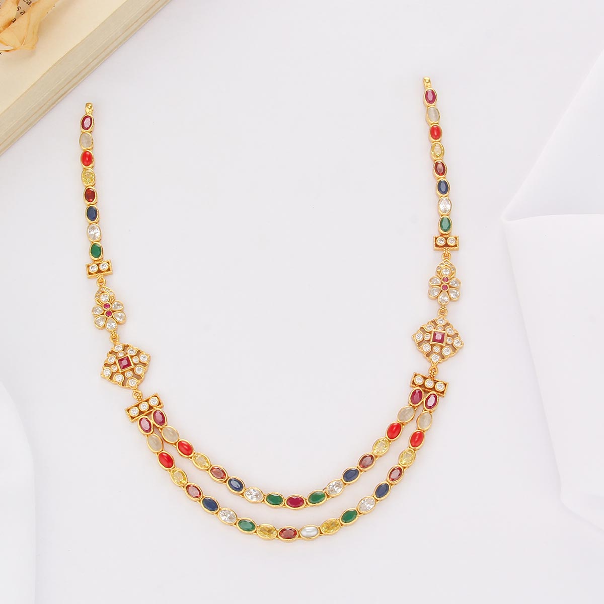 This 92.5 Silver, 24 kt gold-plated, stylish Necklace is studded with semi-precious stones to make a stunning statement. Perfect for any special occasion.
