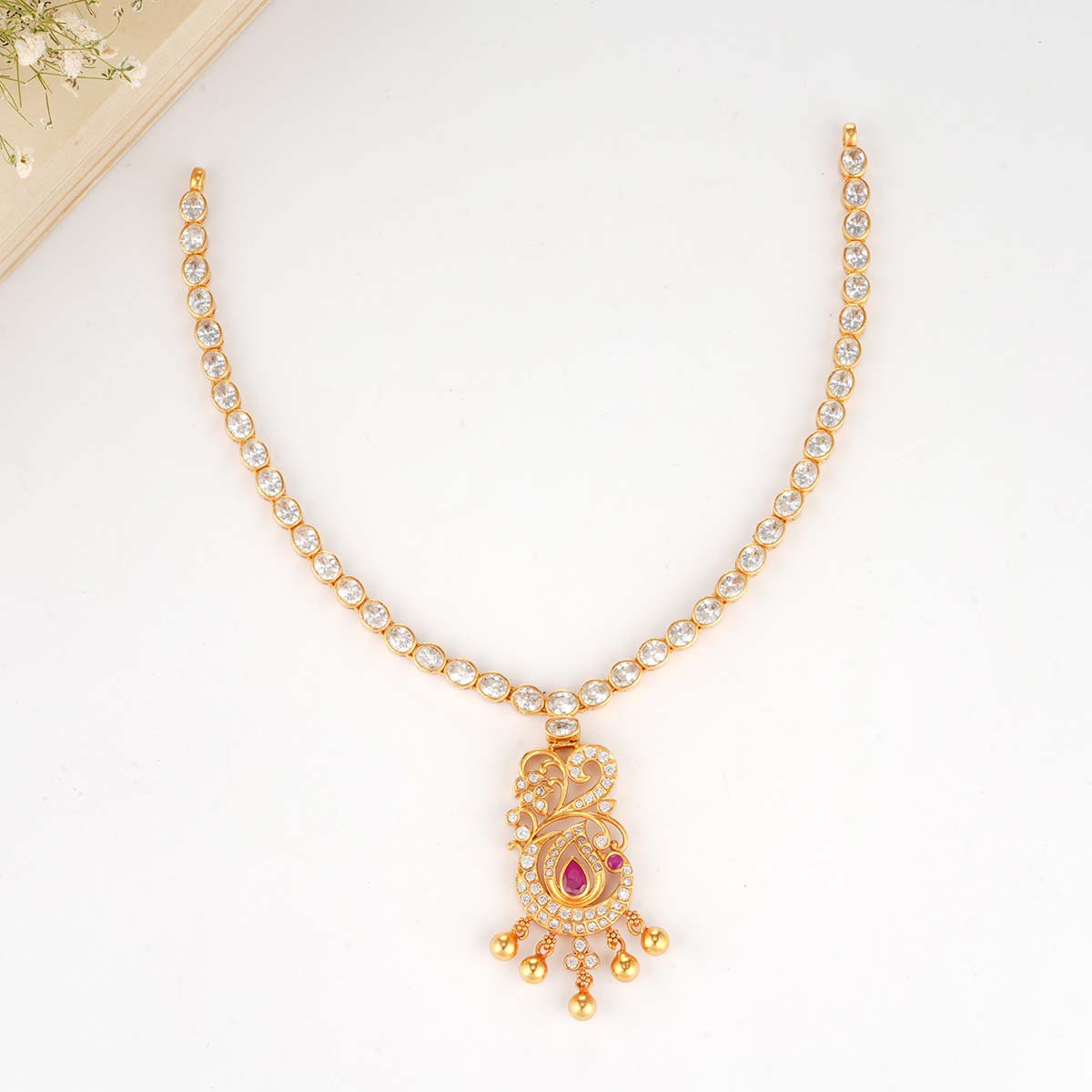 This 92.5 Silver, 24 kt gold-plated, stylish Necklace is studded with semi-precious stones to make a stunning statement. Perfect for any special occasion.