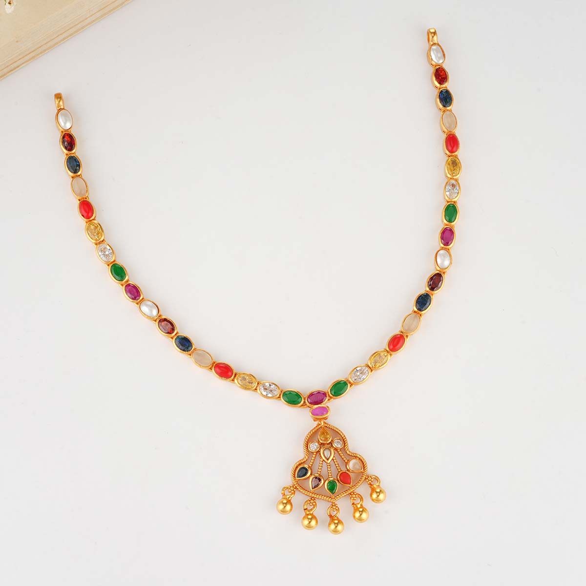 This 92.5 Silver, 24 kt gold-plated, stylish Necklace is studded with semi-precious stones to make a stunning statement. Perfect for any special occasion.