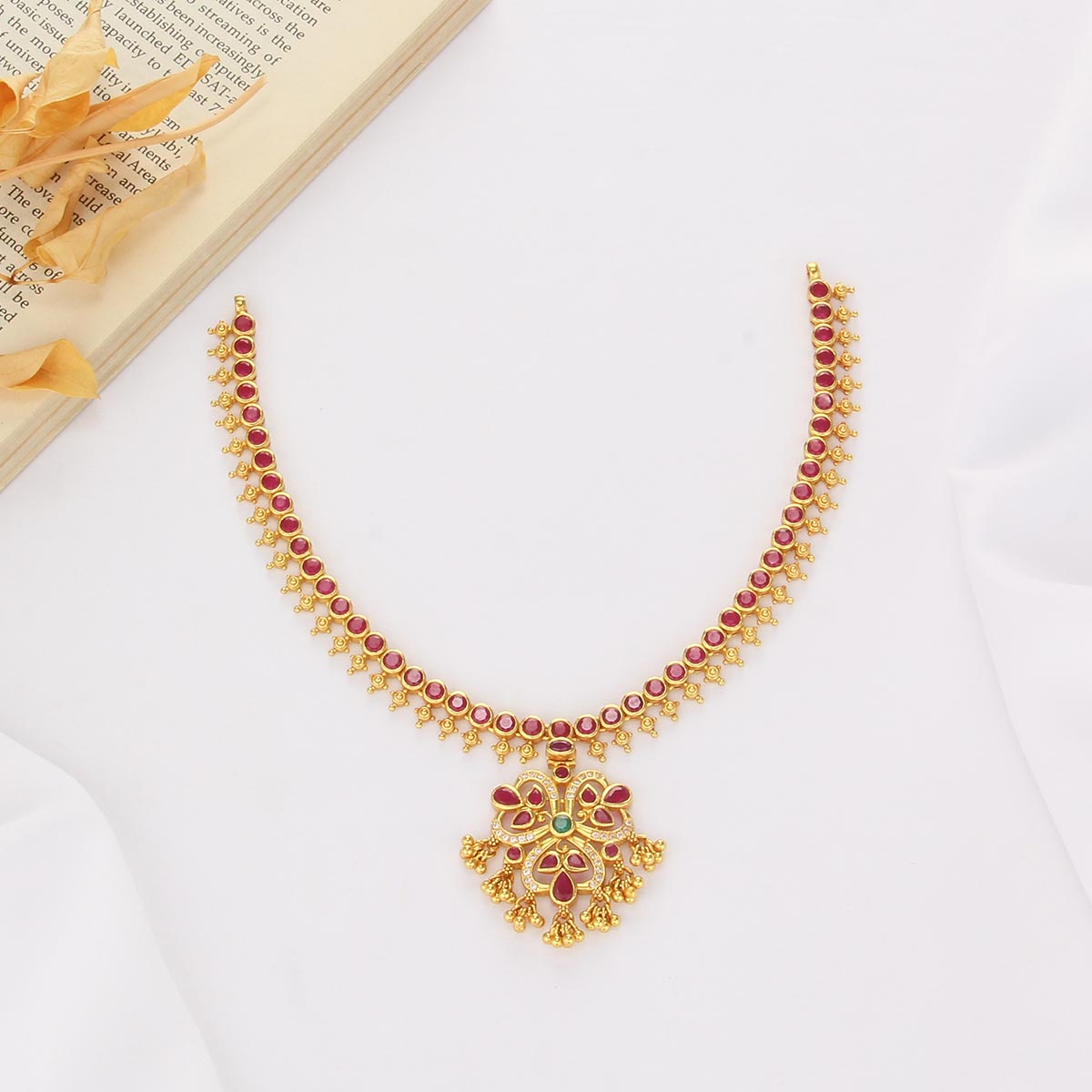 This 92.5 Silver, 24 kt gold-plated, stylish Necklace is studded with semi-precious stones to make a stunning statement. Perfect for any special occasion.