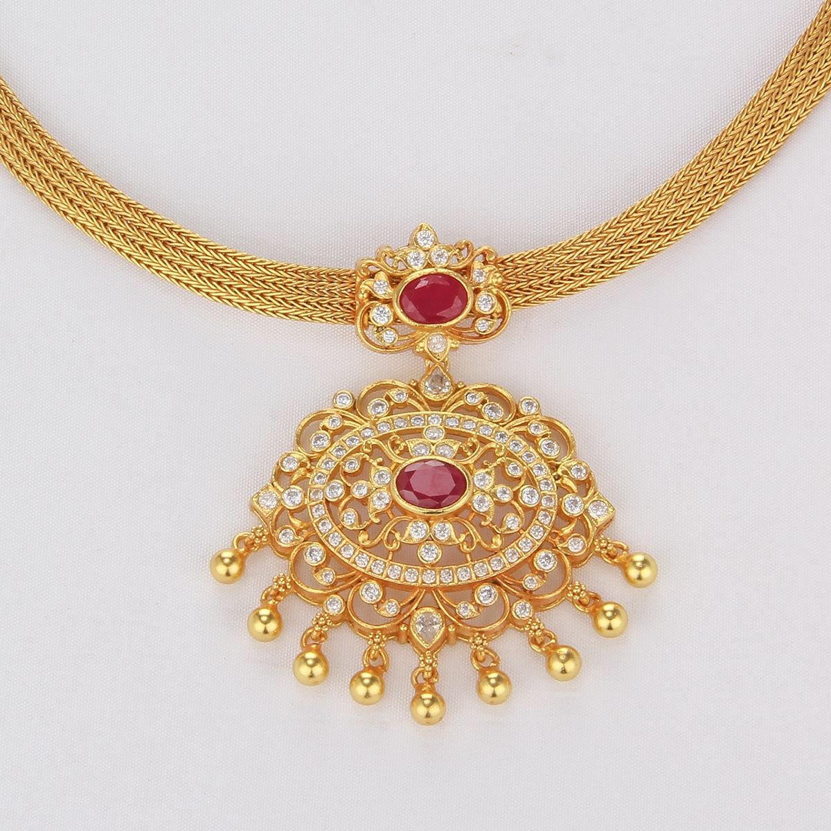 This necklace is crafted from 92.5 Silver and features 24-karat gold plating as well as semiprecious stones.