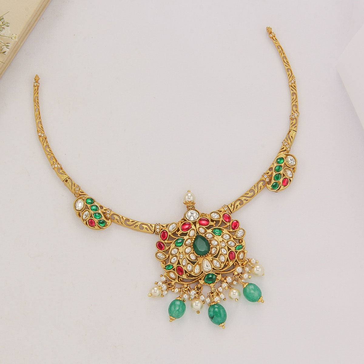 This 92.5 Silver, 24kt gold-plated Short necklace is adorned with semi-precious Kundan stones for a luxurious aesthetic.