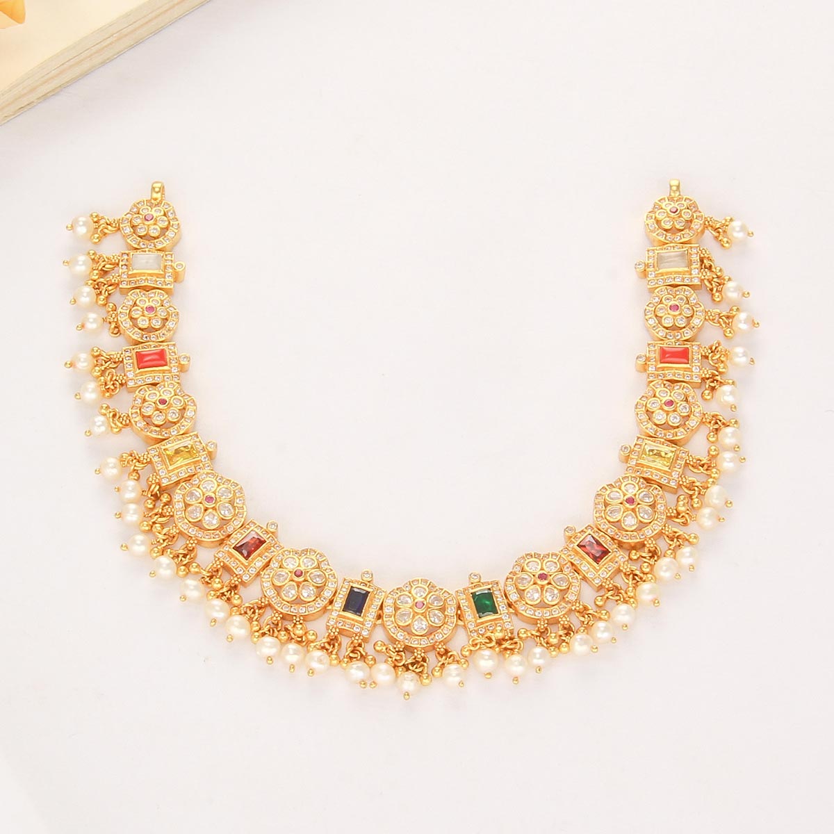 This necklace is crafted from 92.5 Sterling Silver and features 24-karat gold plating as well as semiprecious stones.