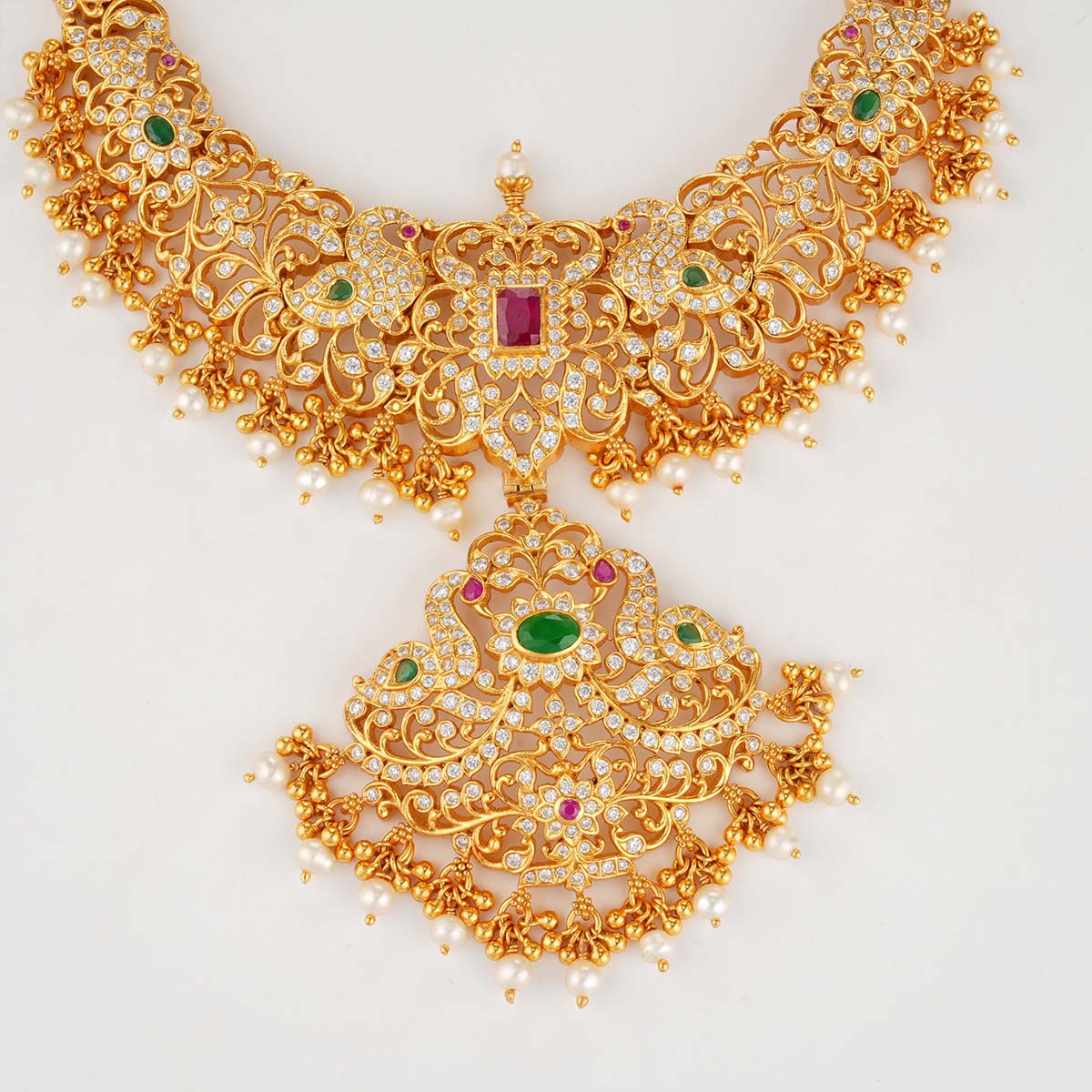 This 92.5 Silver, 24 kt gold-plated, stylish Necklace is studded with semi-precious stones to make a stunning statement. Perfect for any special occasion.