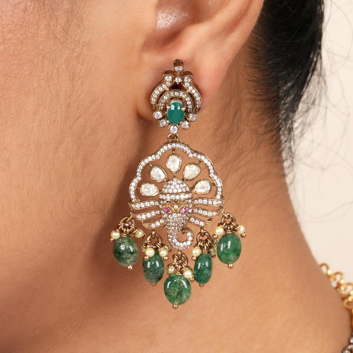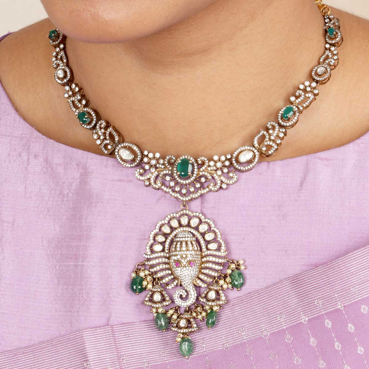 92.5 Silver, Victorian Necklace set studded with Gem Stones and Pearl Beads.