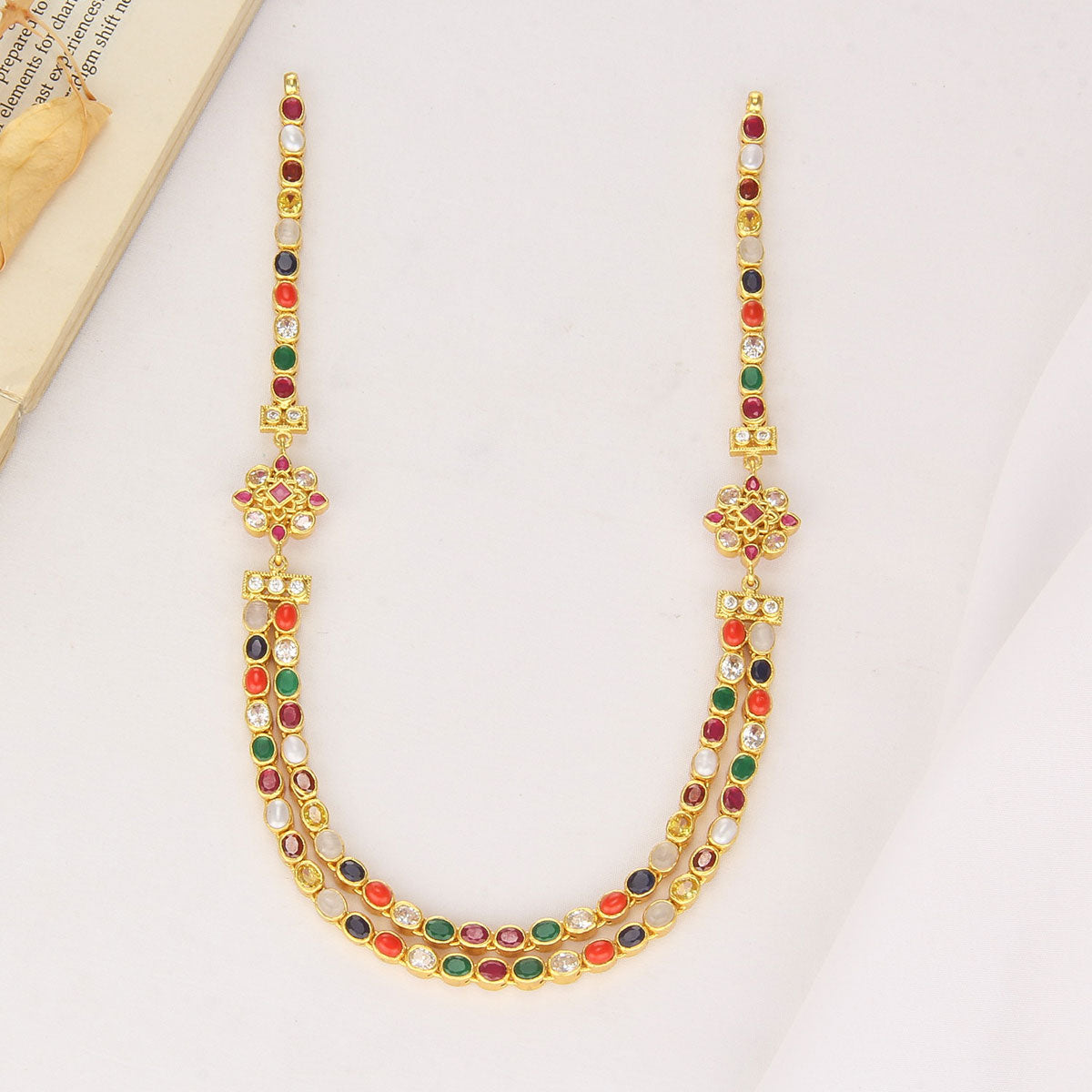 This 92.5 Silver, 24 kt gold-plated, stylish Necklace is studded with semi-precious stones to make a stunning statement. Perfect for any special occasion.