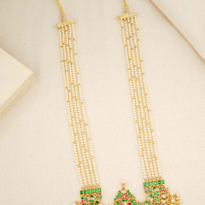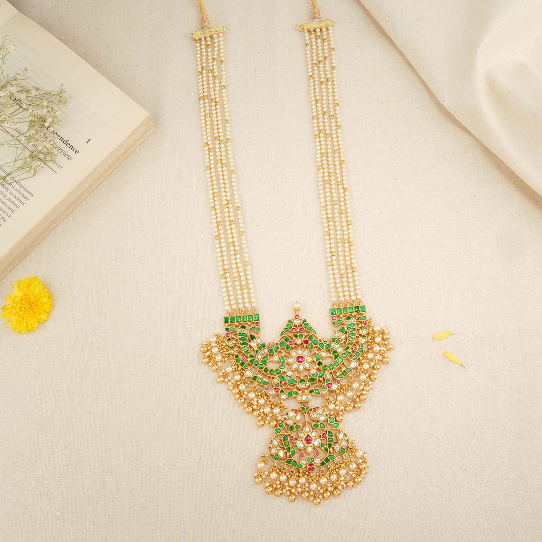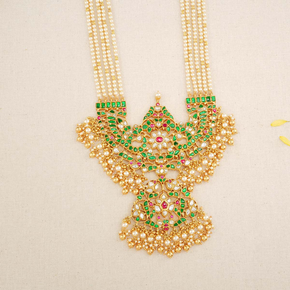 This 92.5 Silver, 24 kt Gold-Plated Necklace is adorned with Semi-precious Kundan Stones for a luxurious aesthetic.