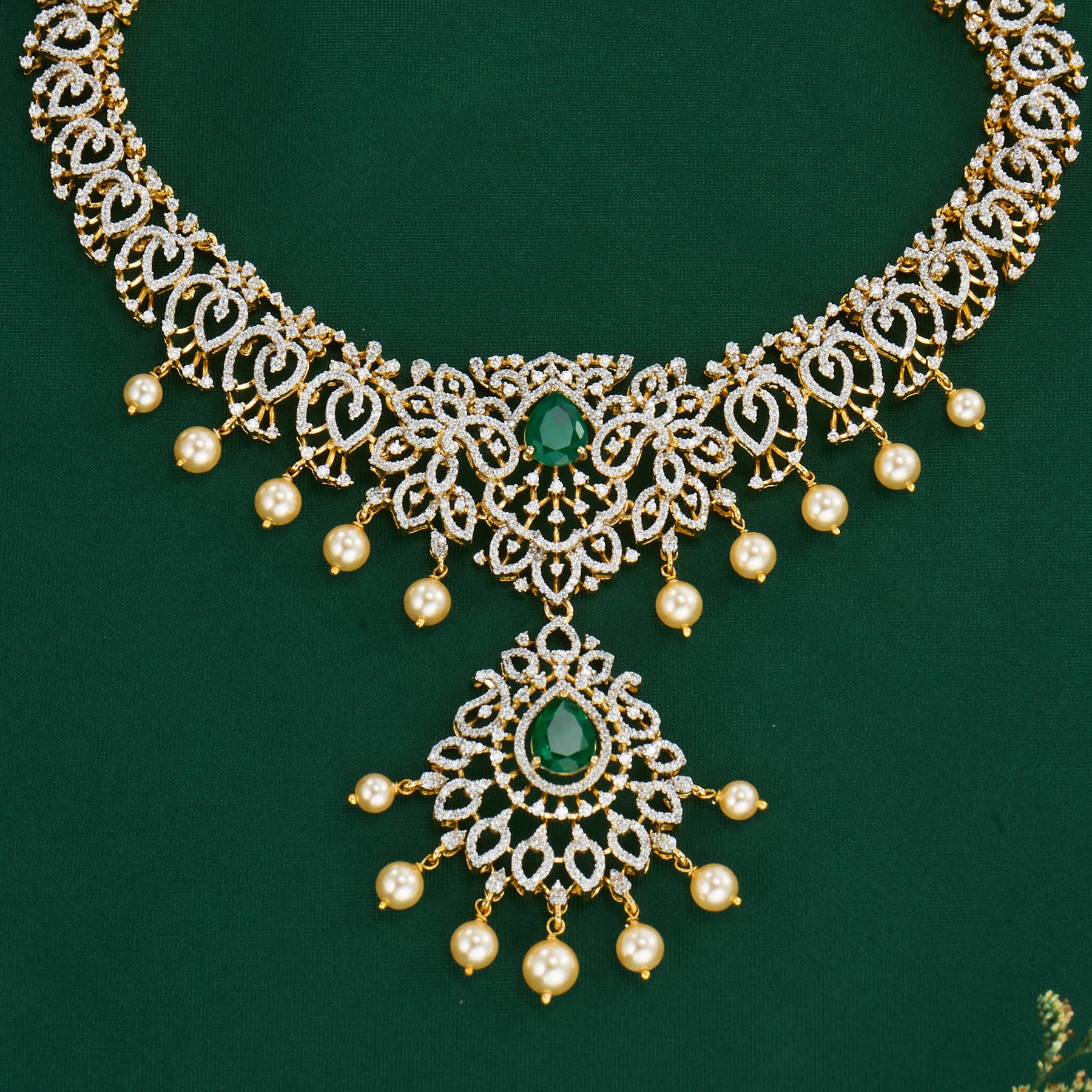 Enjoy the lovely curation of our Avikam Necklace set , crafted with 92.5 silver with the dazzling combination of Zircon and Emerald stones with attractive hanging pearls
