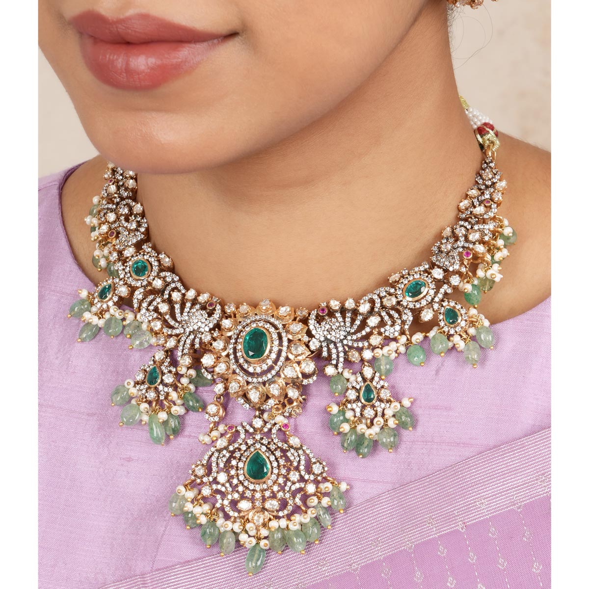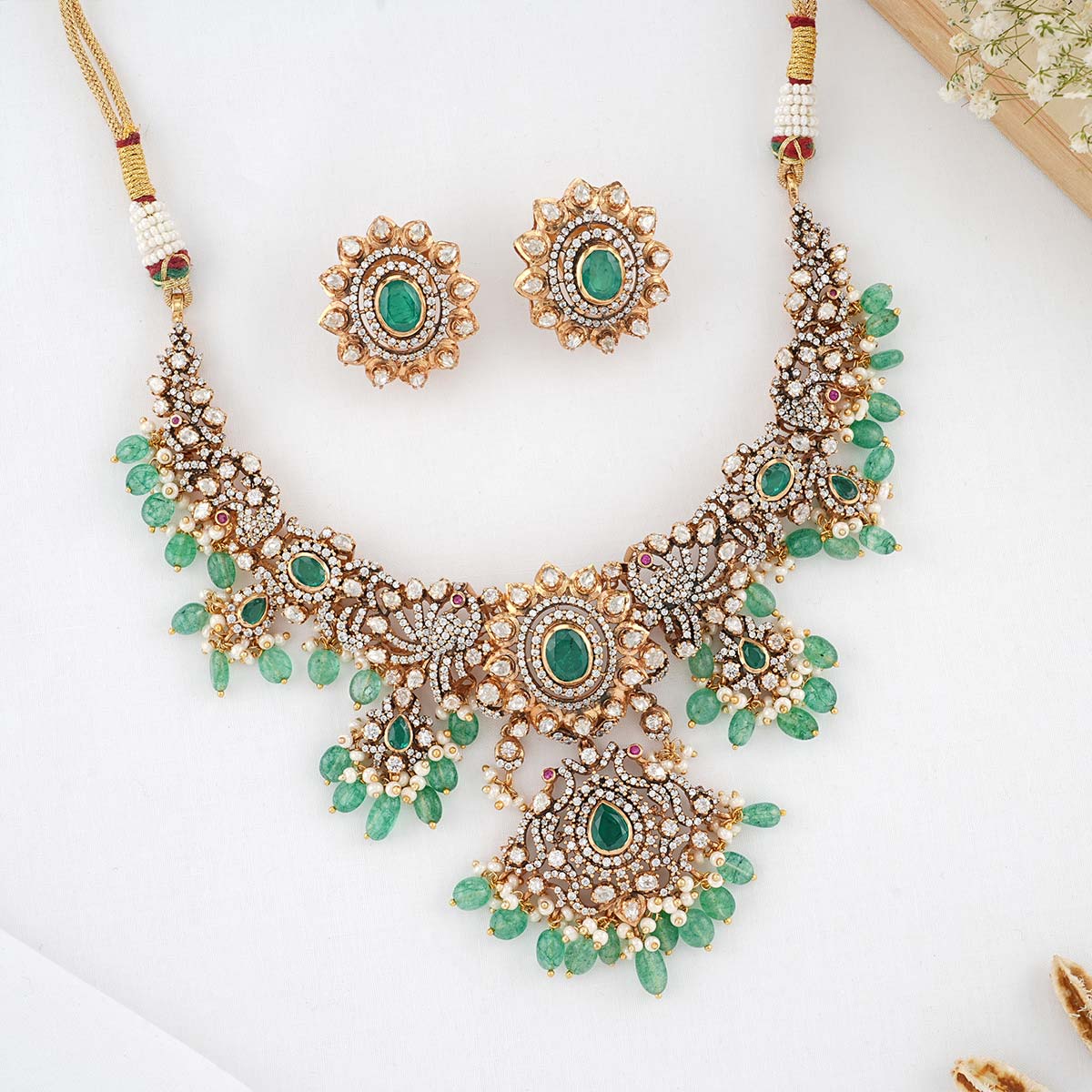 92.5 Silver, Victorian Necklace set studded with Gem Stones and Pearl Beads.