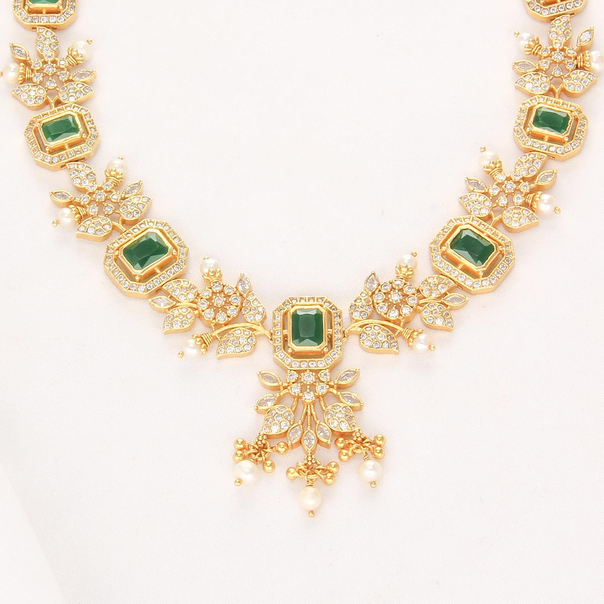 This necklace is crafted from 92.5 Sterling Silver and features 24-karat gold plating as well as semiprecious stones.