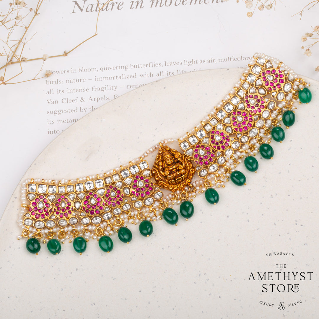 This 92.5 Silver, 24 kt Gold-Plated Choker is adorned with Semi-precious Kundan Stones for a luxurious aesthetic.