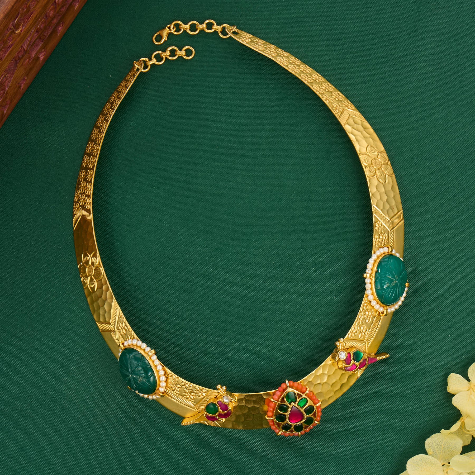 Handcrafted in 92.5 sterling silver with a radiant 24kt gold plating, this Hasli Choker is a stunning tribute to India's timeless craftsmanship — where hand-hammered Dapka work, intricate Meenakari enamel and a sculpted peacock motif come together in perfect artistry.