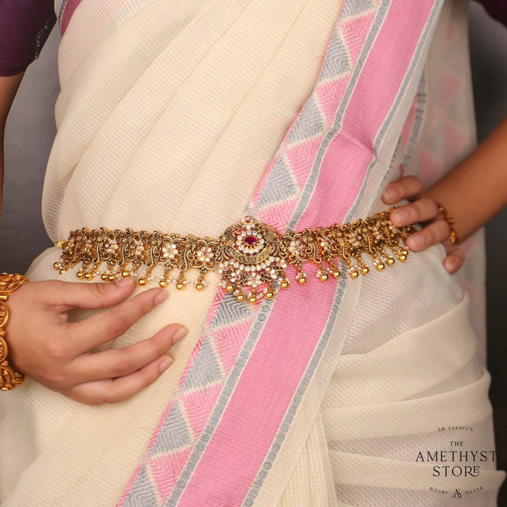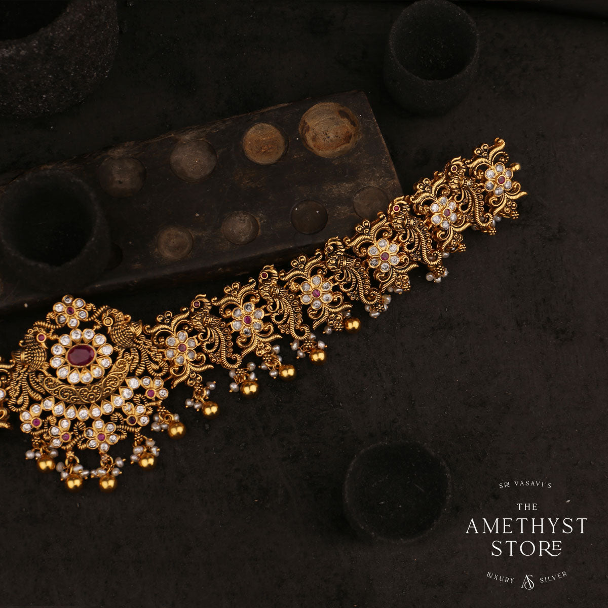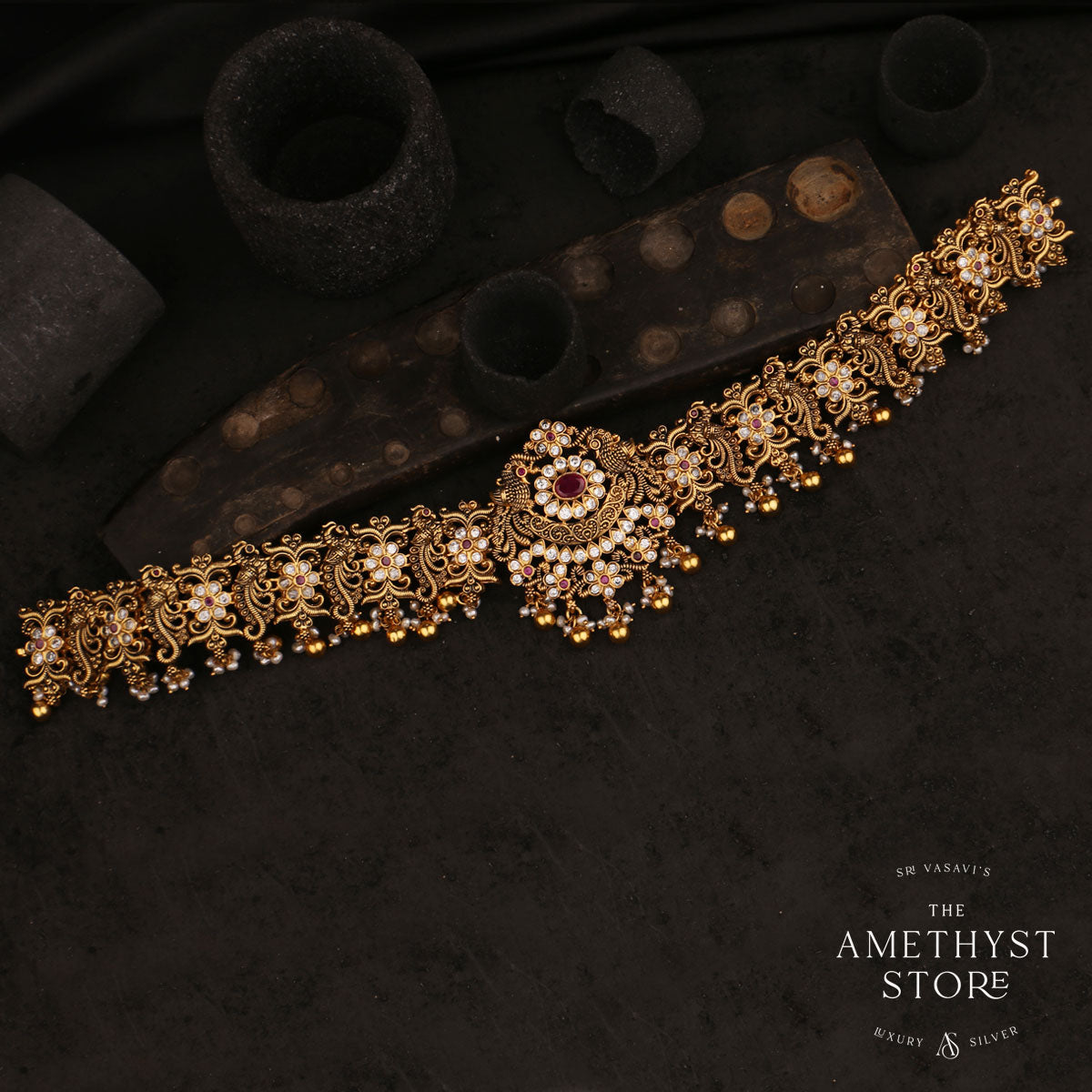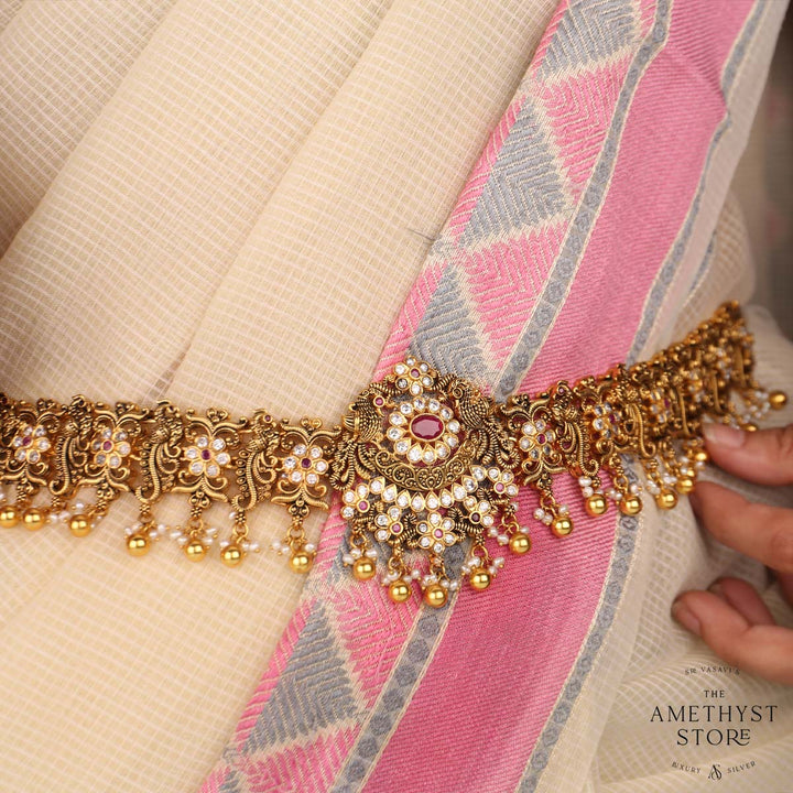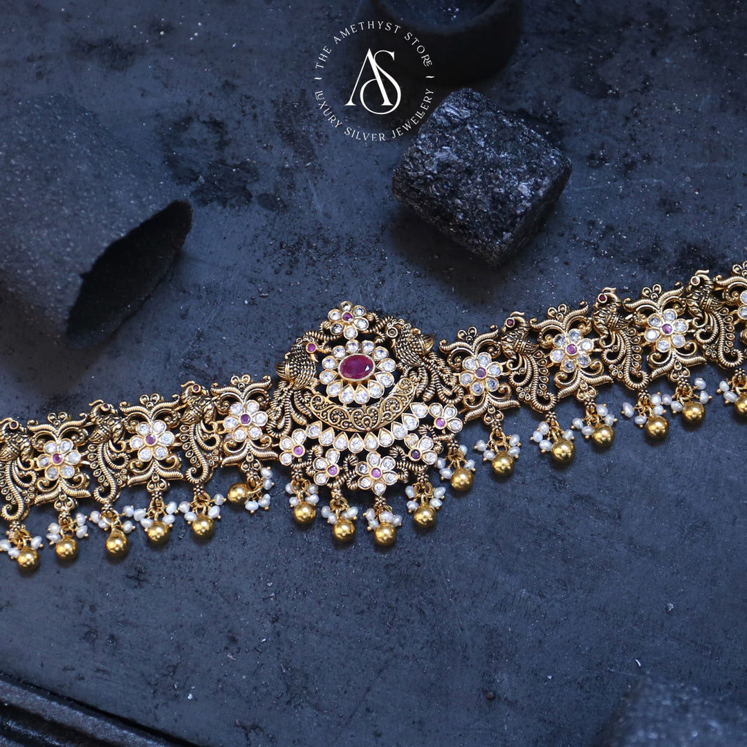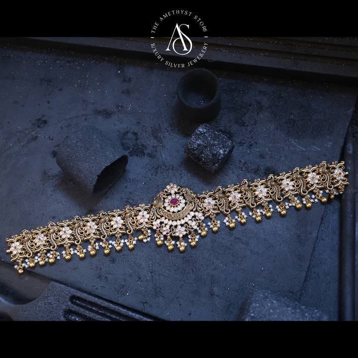 92.5 gold plated with Mayuri nagas oddiyanam/vadanam. this is studded with Semi Precious stones that casts an auspicious blessing on the bride.