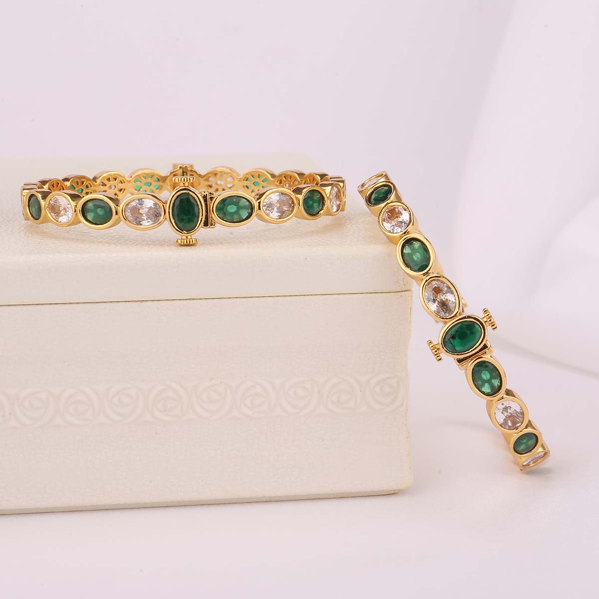 This 92.5 Silver, 24 kt gold-plated stylish Bangles is studded with semi-precious stones to make a stunning statement. Perfect for both formal and casual occasions.