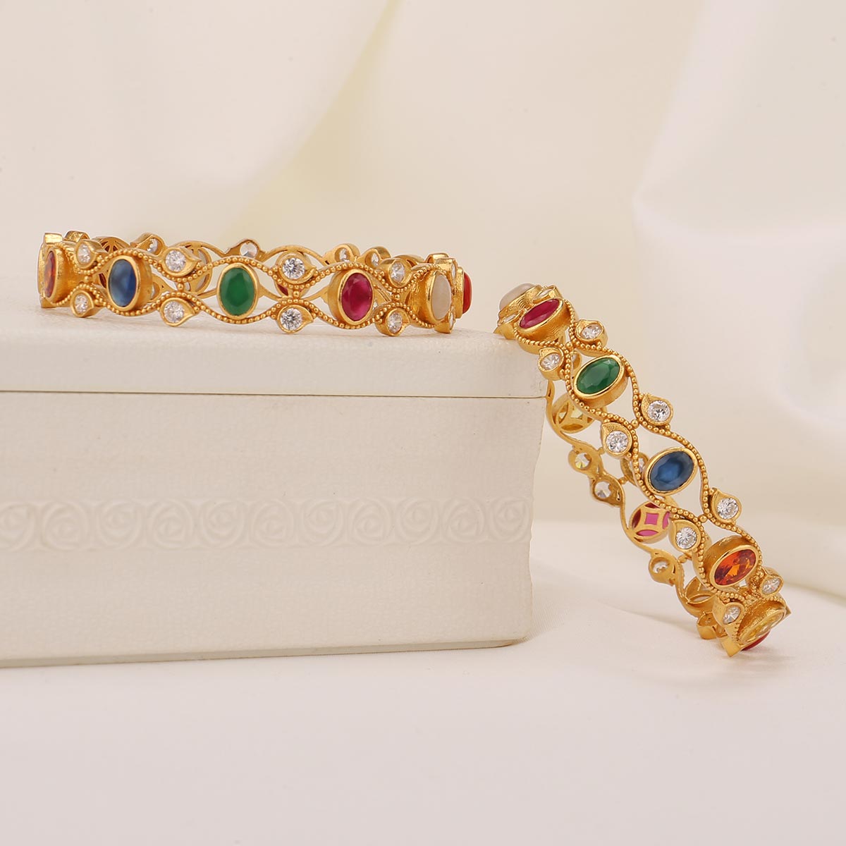 This 92.5 Silver, 24 kt gold-plated stylish Bangles is studded with semi-precious stones to make a stunning statement. Perfect for both formal and casual occasions.
