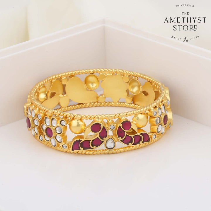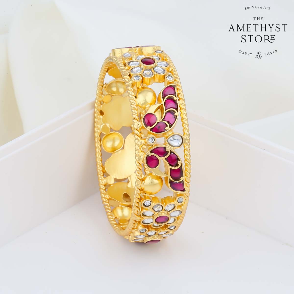 This 92.5 Silver, 24 kt Gold-Plated Bangles is adorned with Semi-precious Kundan Stones for a luxurious aesthetic.