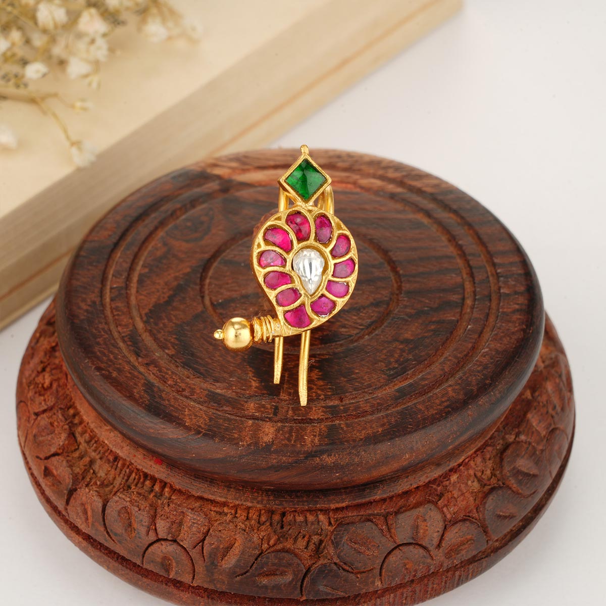 This 92.5 Silver, 24 kt Gold-Plated Jada Billa is adorned with Semi-precious Kundan Stones for a luxurious aesthetic.