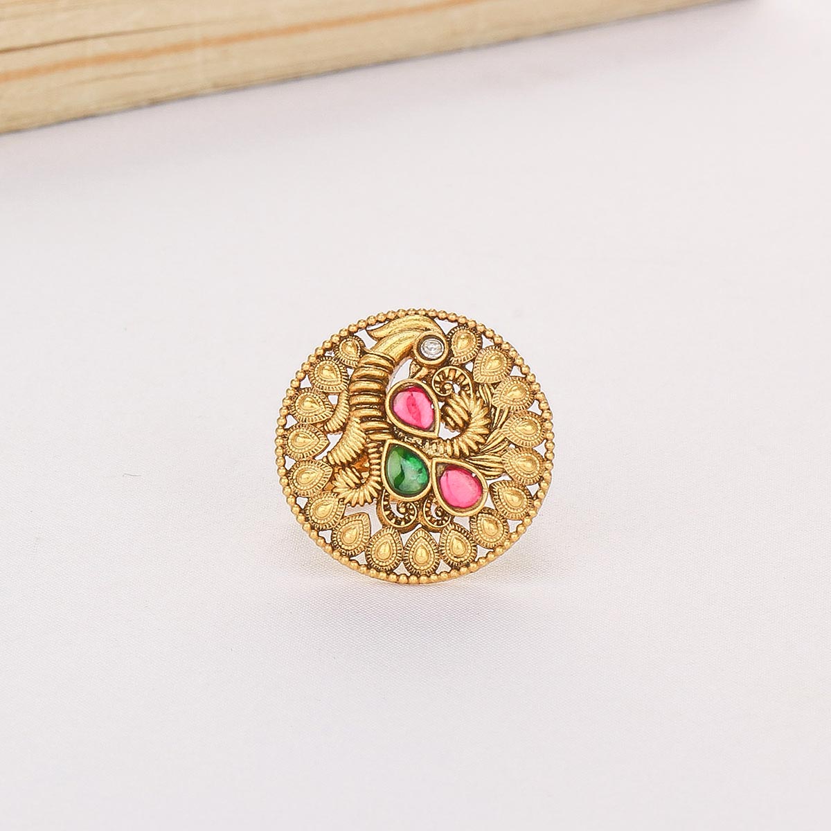 This 92.5 Silver, 24 kt Gold-Plated Ring is adorned with Semi-precious Kundan Stones for a luxurious aesthetic.