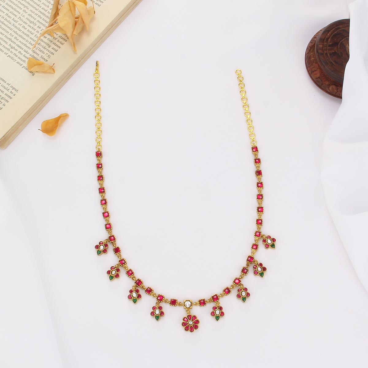 This 92.5 Silver, 24 kt Gold-Plated Necklace is adorned with Semi-precious Kundan Stones for a luxurious aesthetic.