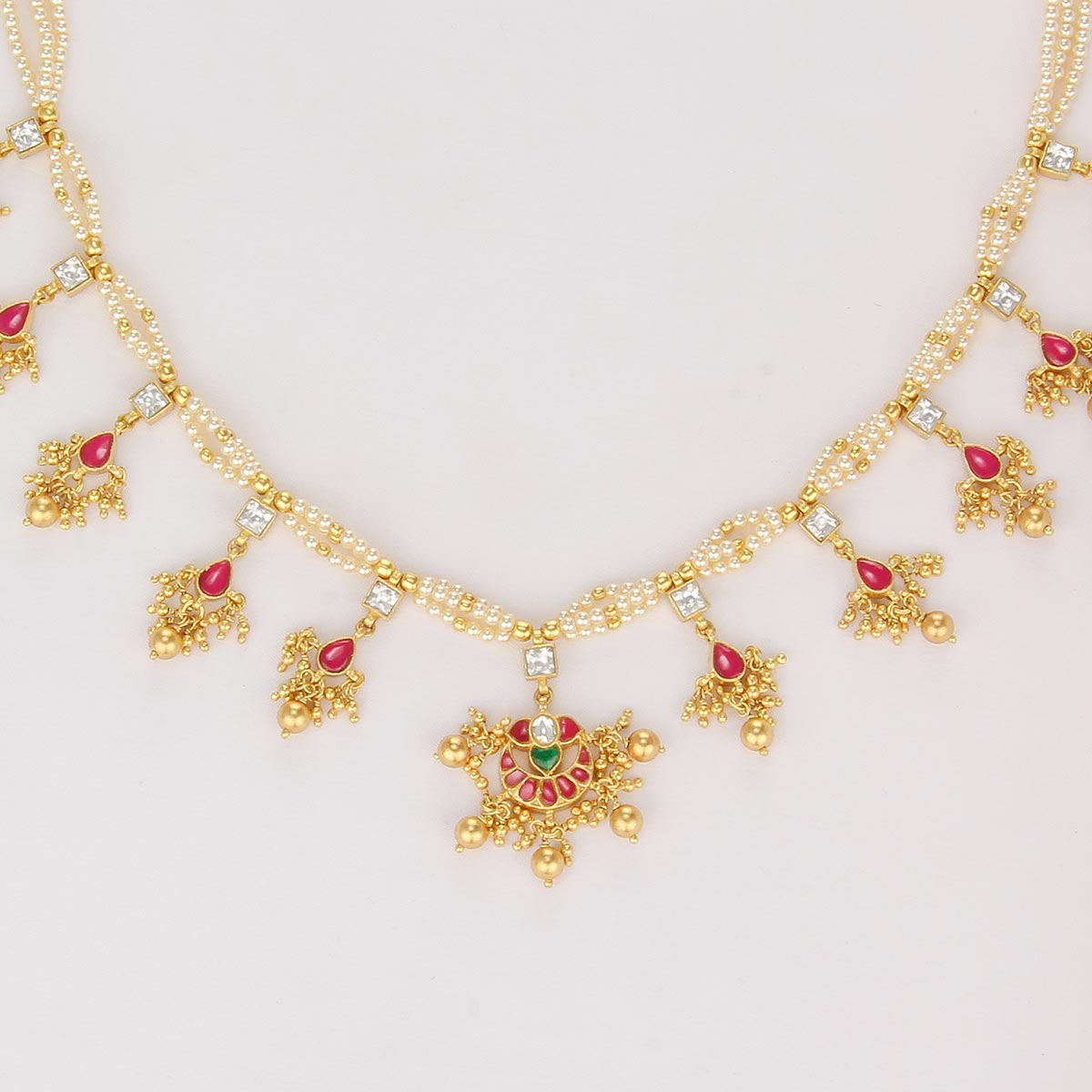 This 92.5 Silver, 24kt gold-plated necklace is adorned with semi-precious kundan stones for a luxurious aesthetic.