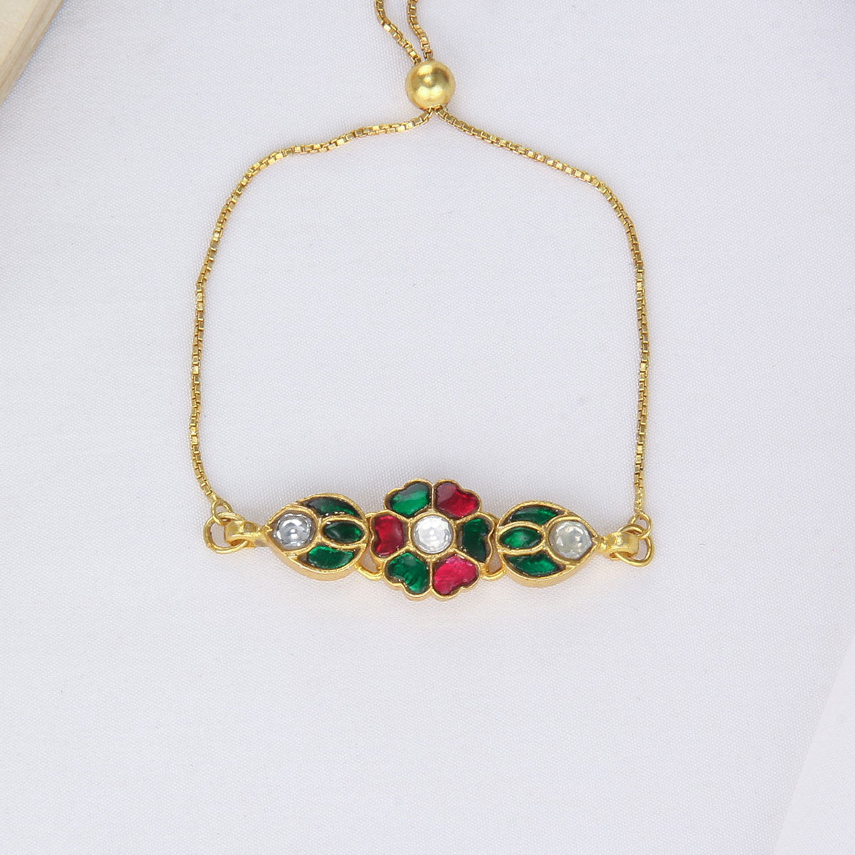 This 92.5 Silver, 24 kt Gold-Plated bracelet is adorned with Semi-precious Kundan Stones for a luxurious aesthetic.
