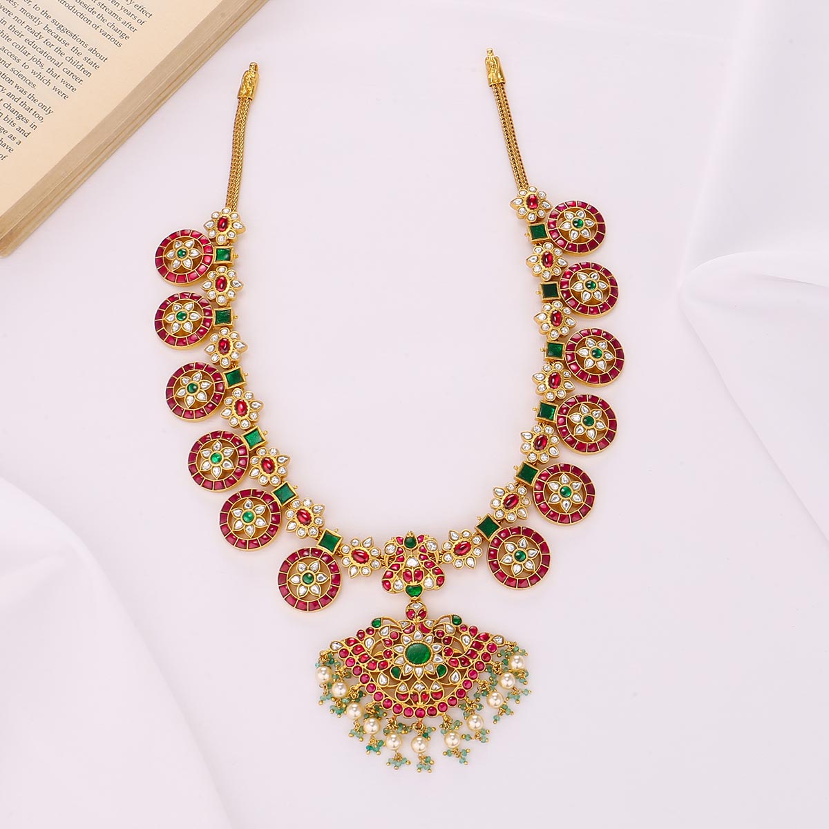 This 92.5 Silver, 24 kt Gold-Plated Necklace is adorned with Semi-precious Kundan Stones for a luxurious aesthetic.