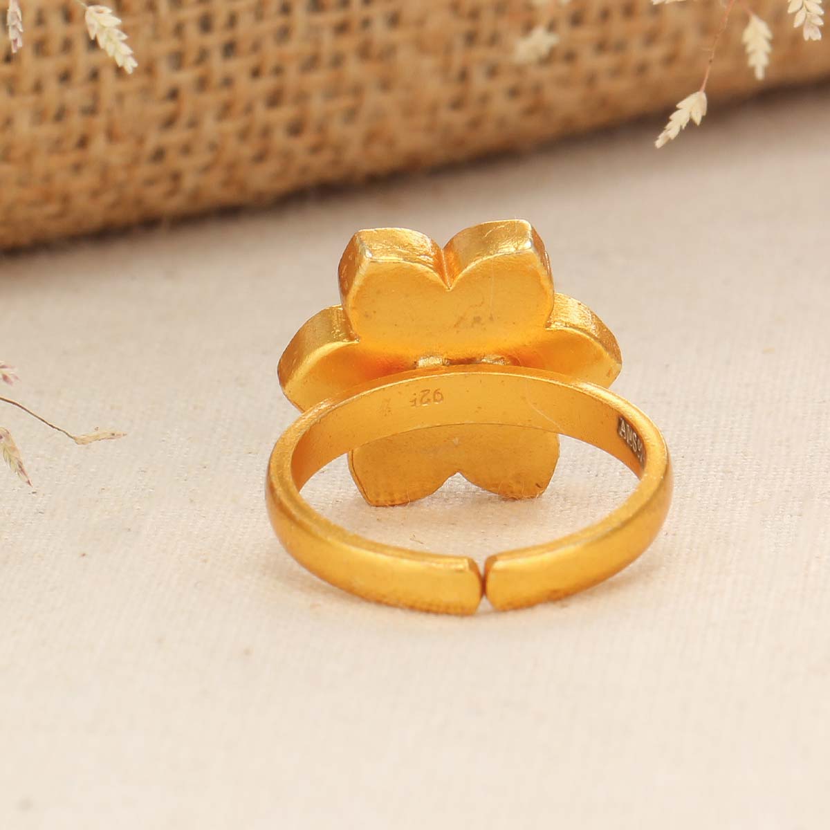 This 92.5 Silver, 24 kt Gold-Plated Ring is adorned with Semi-precious Kundan Stones for a luxurious aesthetic.