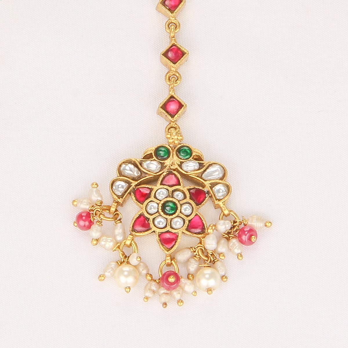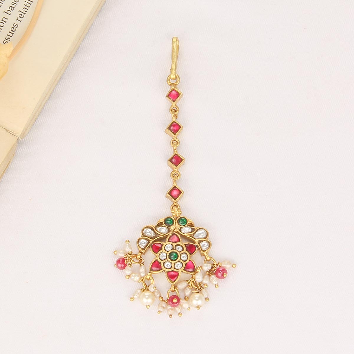 This 92.5 Silver, 24 kt Gold-Plated Maangtikka is adorned with Semi-precious Kundan Stones for a luxurious aesthetic.