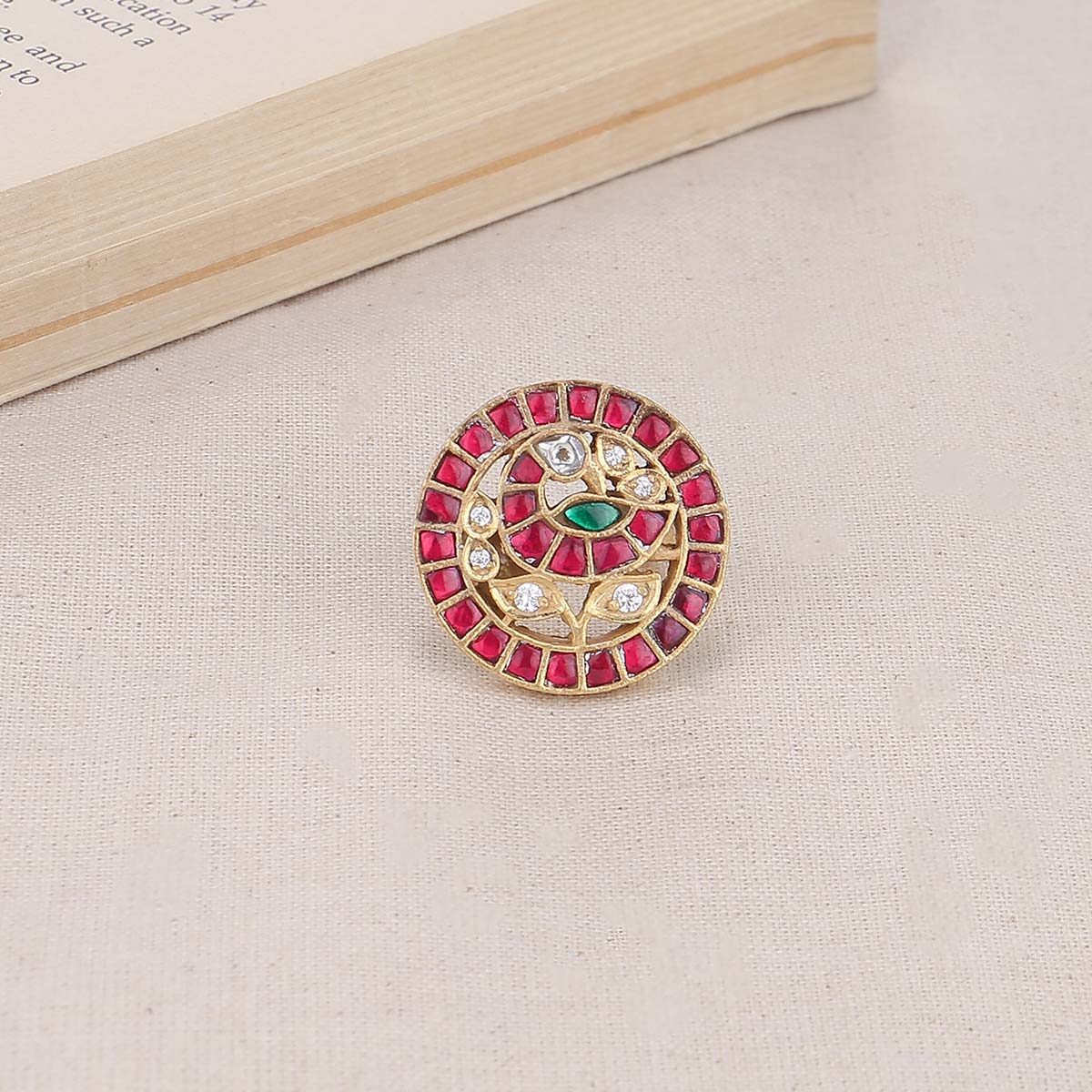 This 92.5 Silver, 24 kt Gold-Plated Ring is adorned with Semi-precious Kundan Stones for a luxurious aesthetic.