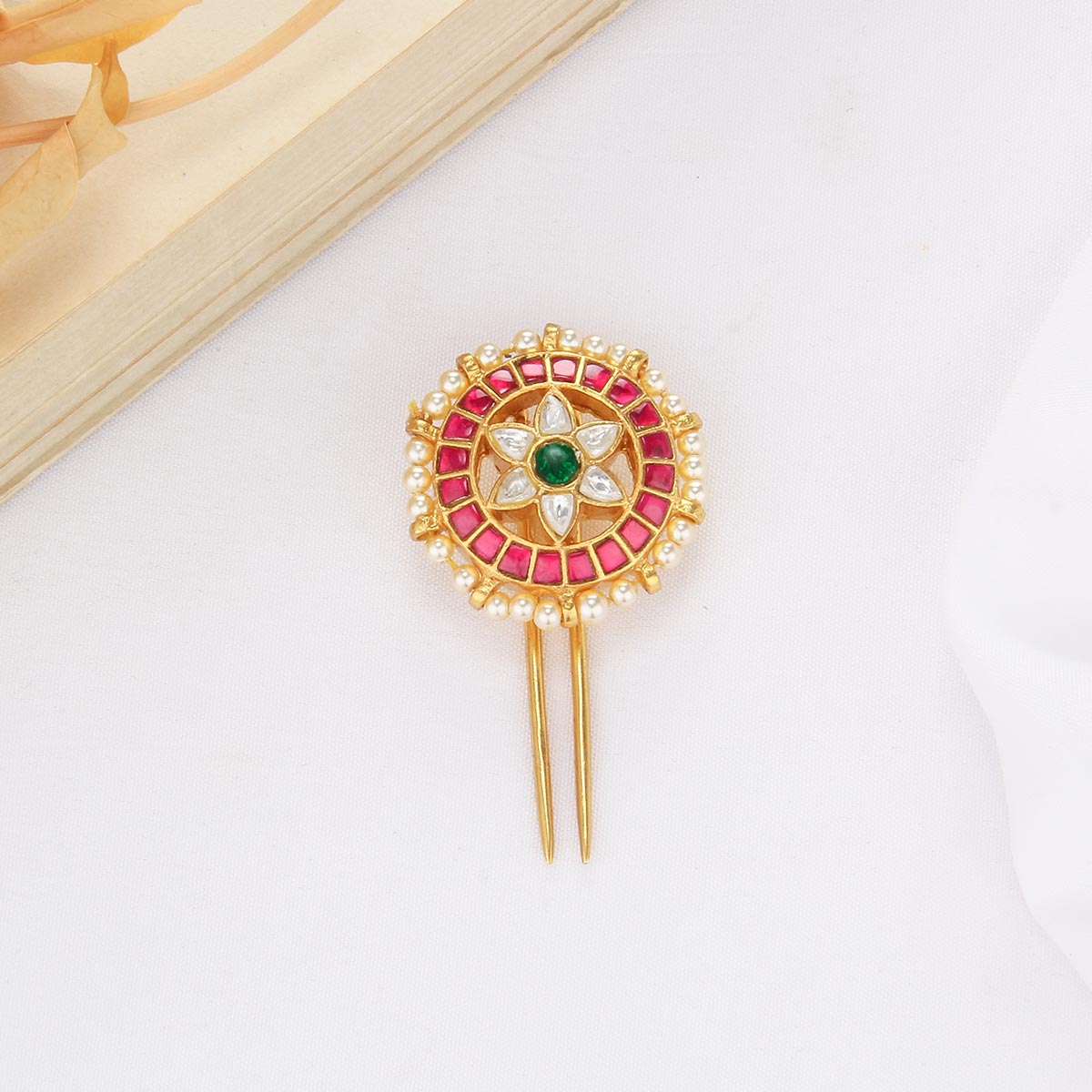 This 92.5 Silver, 24 kt Gold-Plated Jada Billa is adorned with Semi-precious Kundan Stones for a luxurious aesthetic.