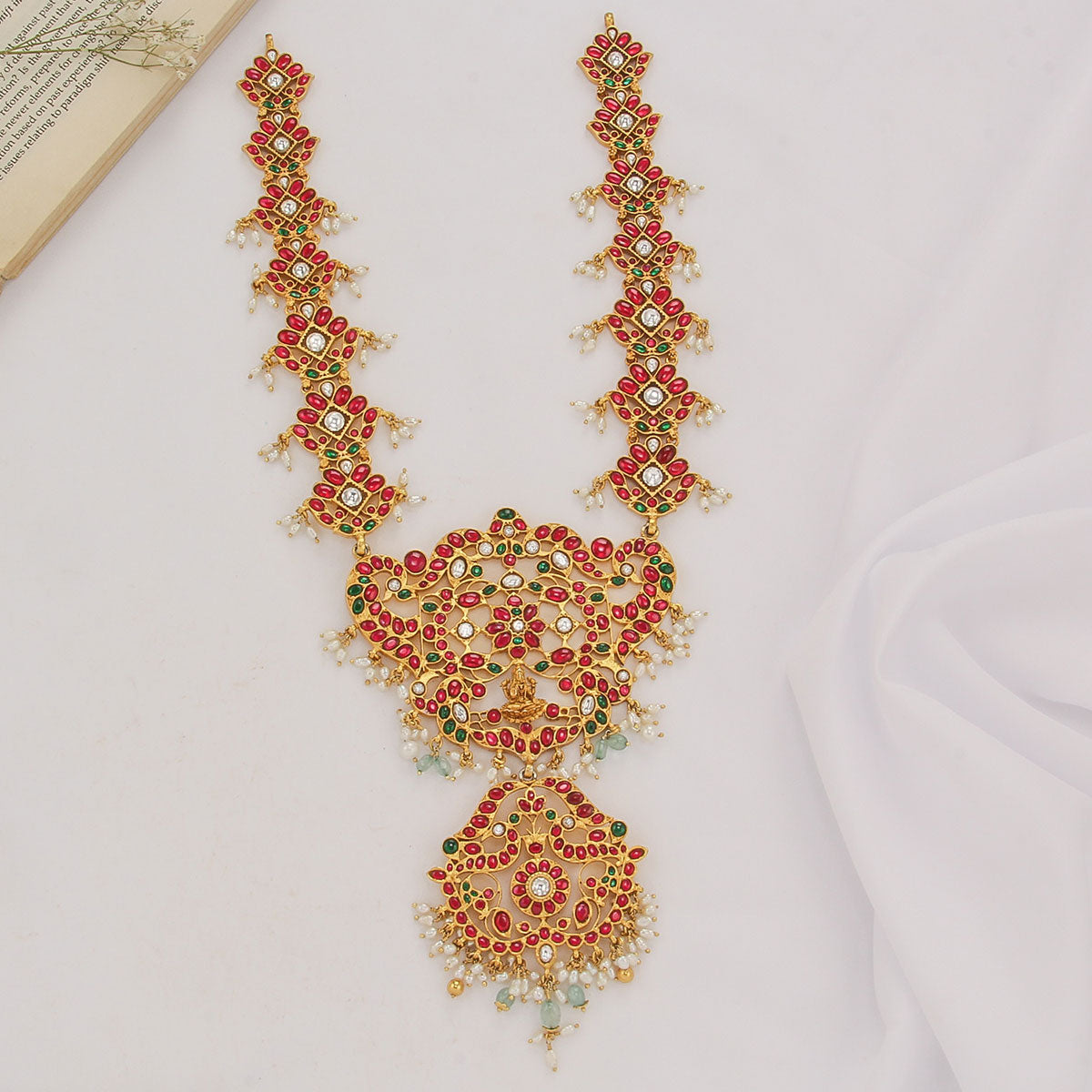 This 92.5 Silver, 24kt gold-plated long necklace is adorned with semi-precious kundan stones and Beads for a luxurious aesthetic.