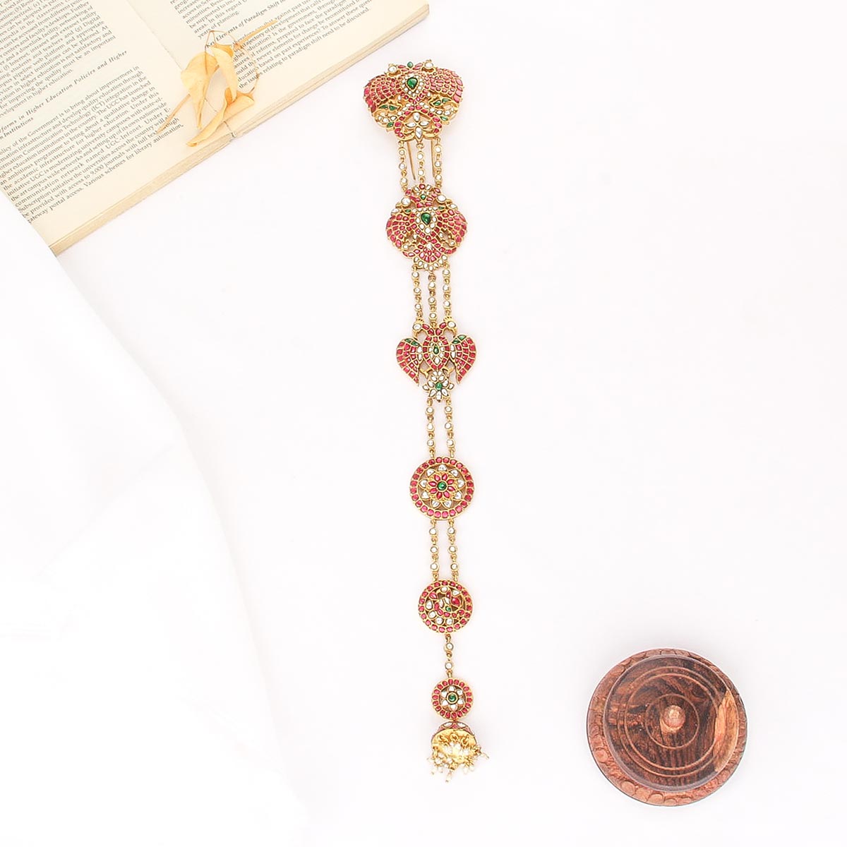 This 92.5 Silver, 24 kt Gold-Plated Jada Billa is adorned with Semi-precious Kundan Stones for a luxurious aesthetic.