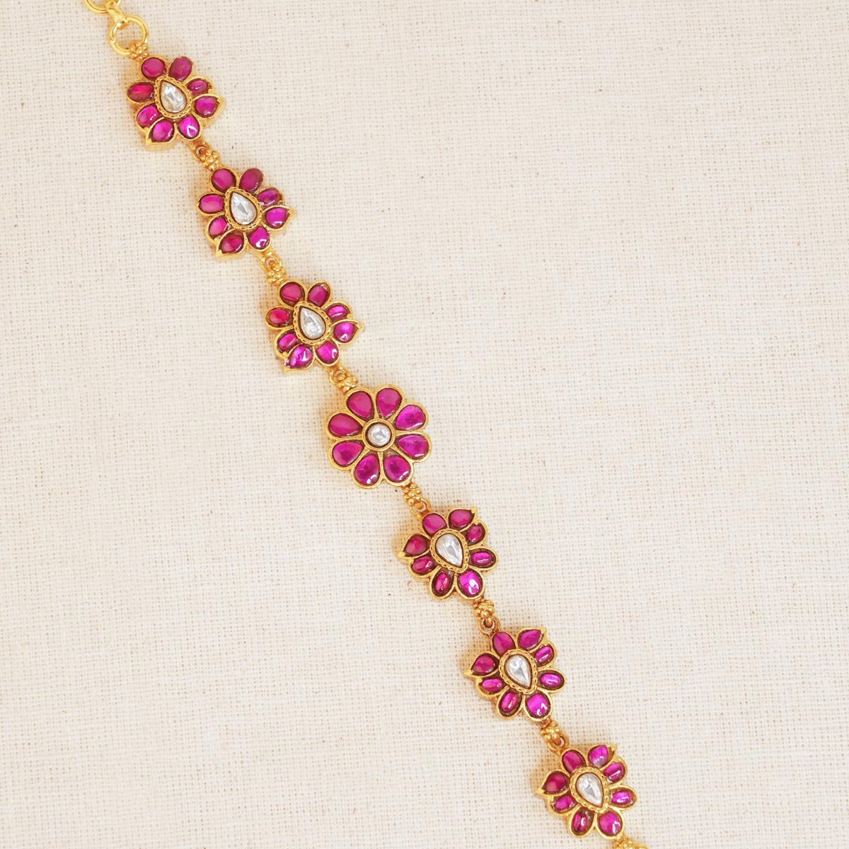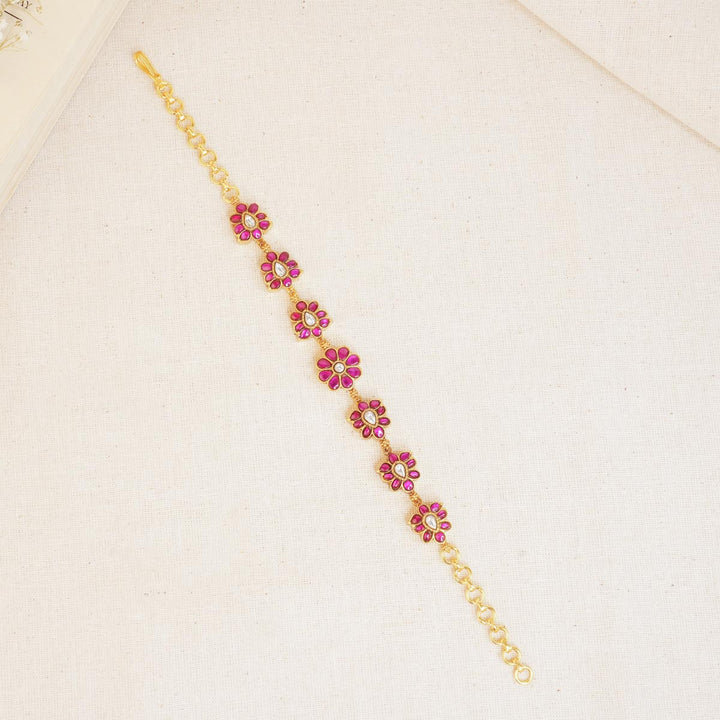 This 92.5 Silver, 24 kt Gold-Plated bracelet is adorned with Semi-precious Kundan Stones for a luxurious aesthetic.