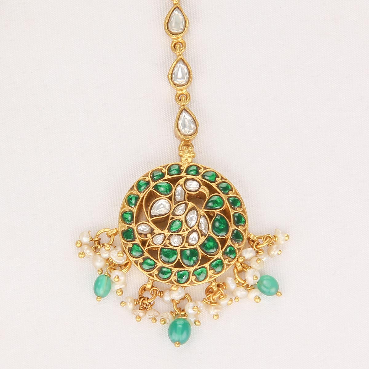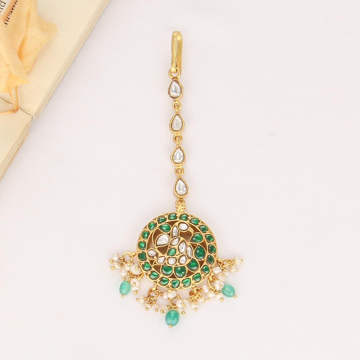 This 92.5 Silver, 24 kt Gold-Plated Maangtikka is adorned with Semi-precious Kundan Stones for a luxurious aesthetic.