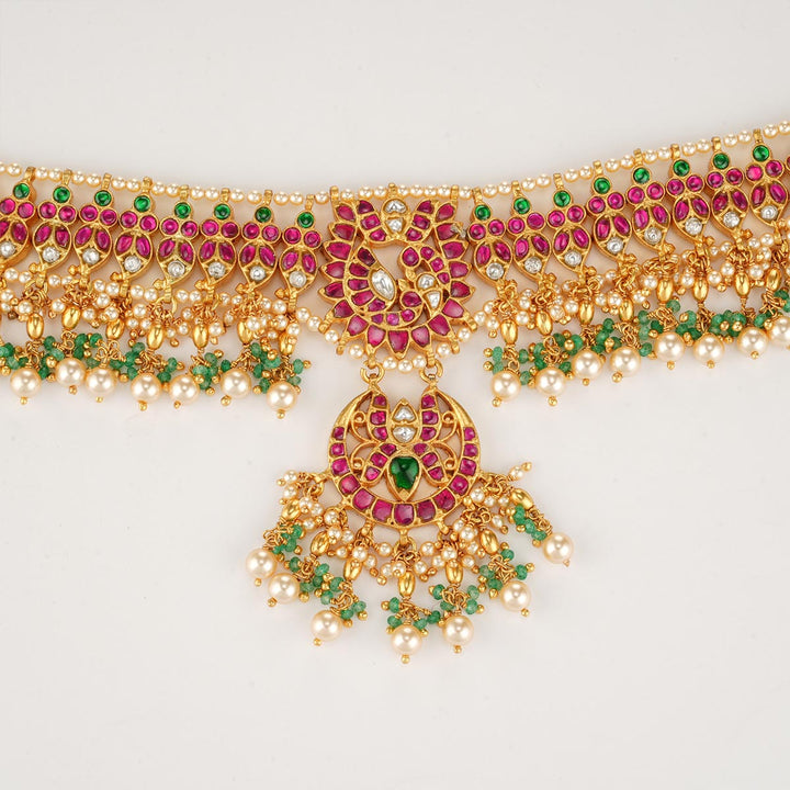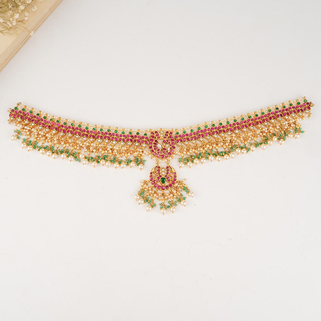 This 92.5 Silver, 24 kt Gold-Plated Choker is adorned with Semi-precious Kundan Stones for a luxurious aesthetic.