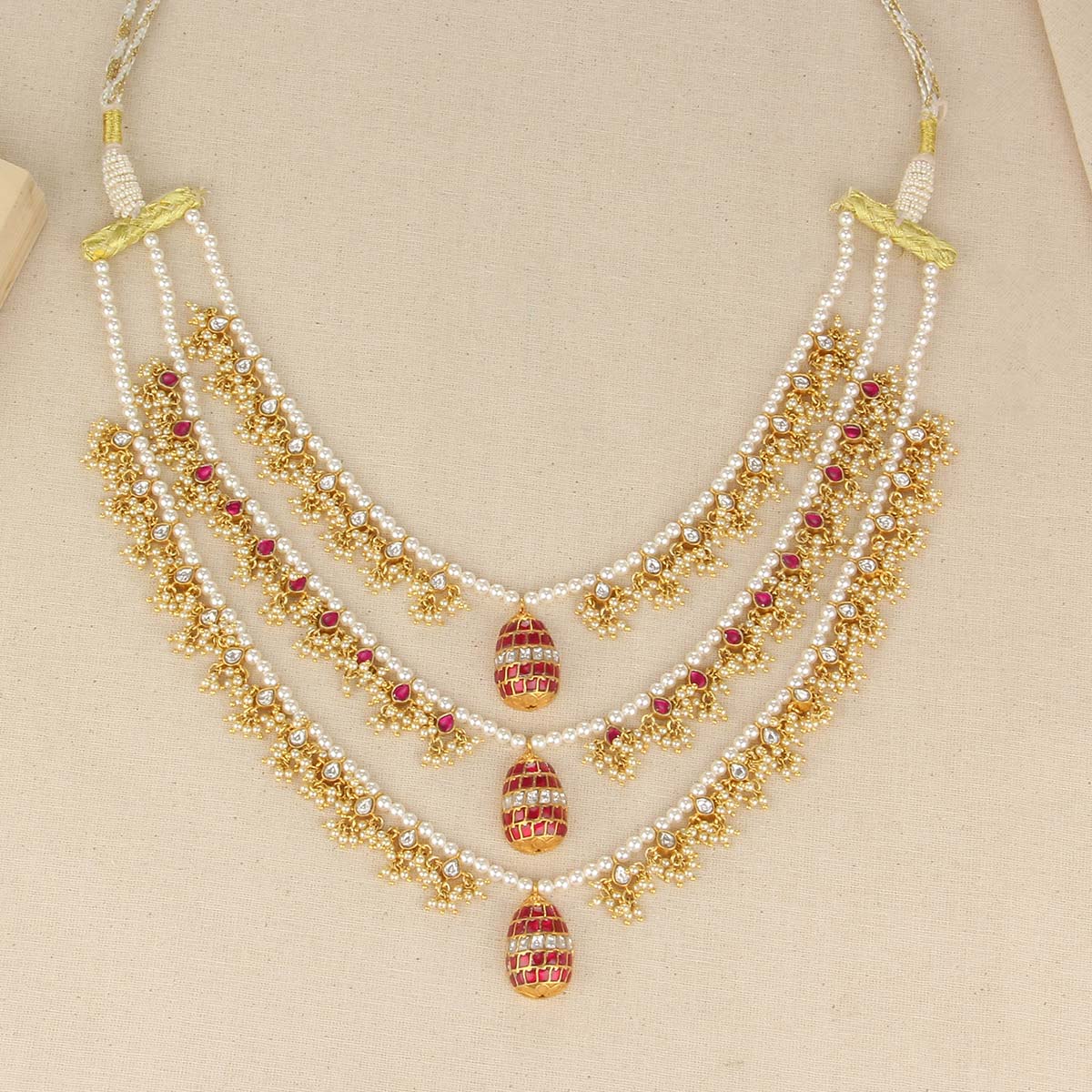 This 92.5 Silver, 24 kt Gold-Plated Necklace is adorned with Semi-precious Kundan Stones for a luxurious aesthetic.