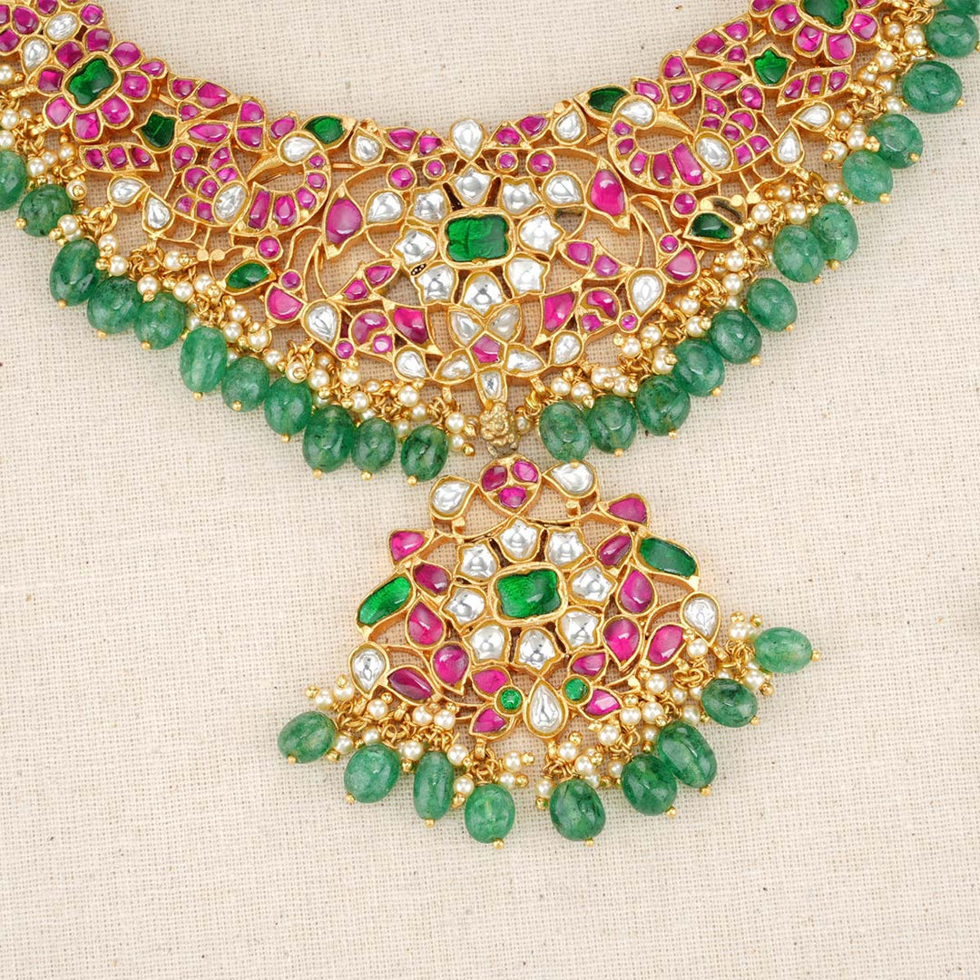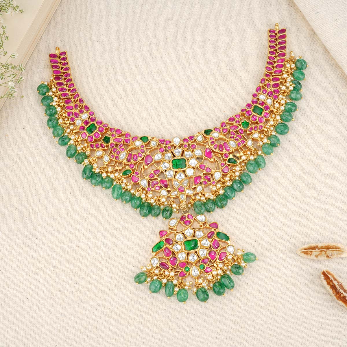 This 92.5 Silver, 24 kt Gold-Plated Necklace is adorned with Semi-precious Kundan Stones for a luxurious aesthetic.