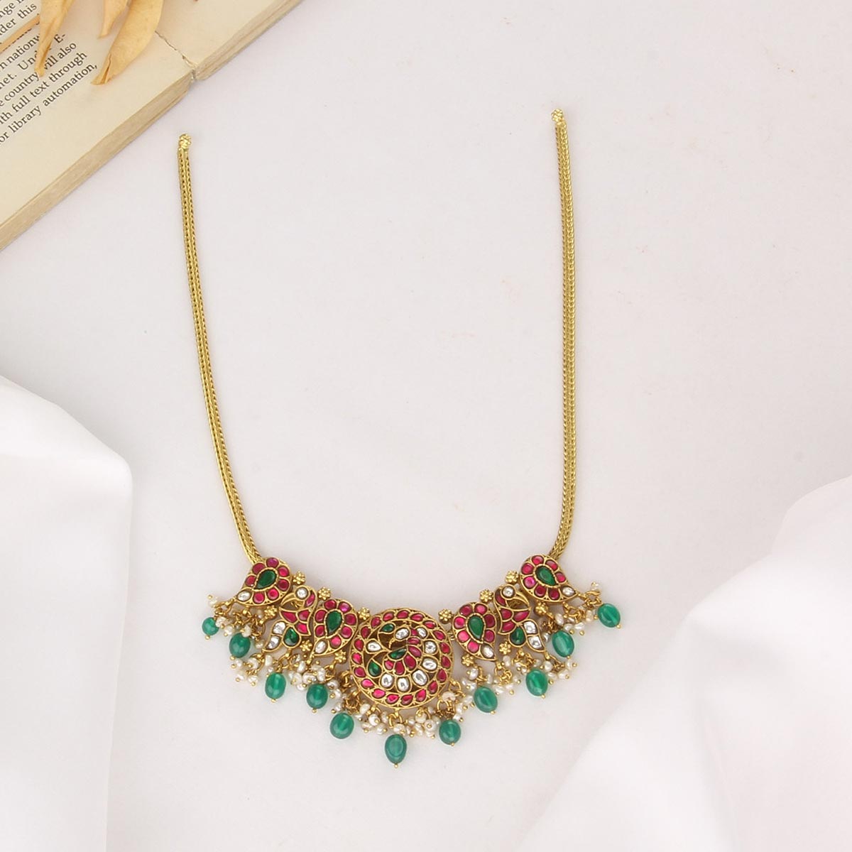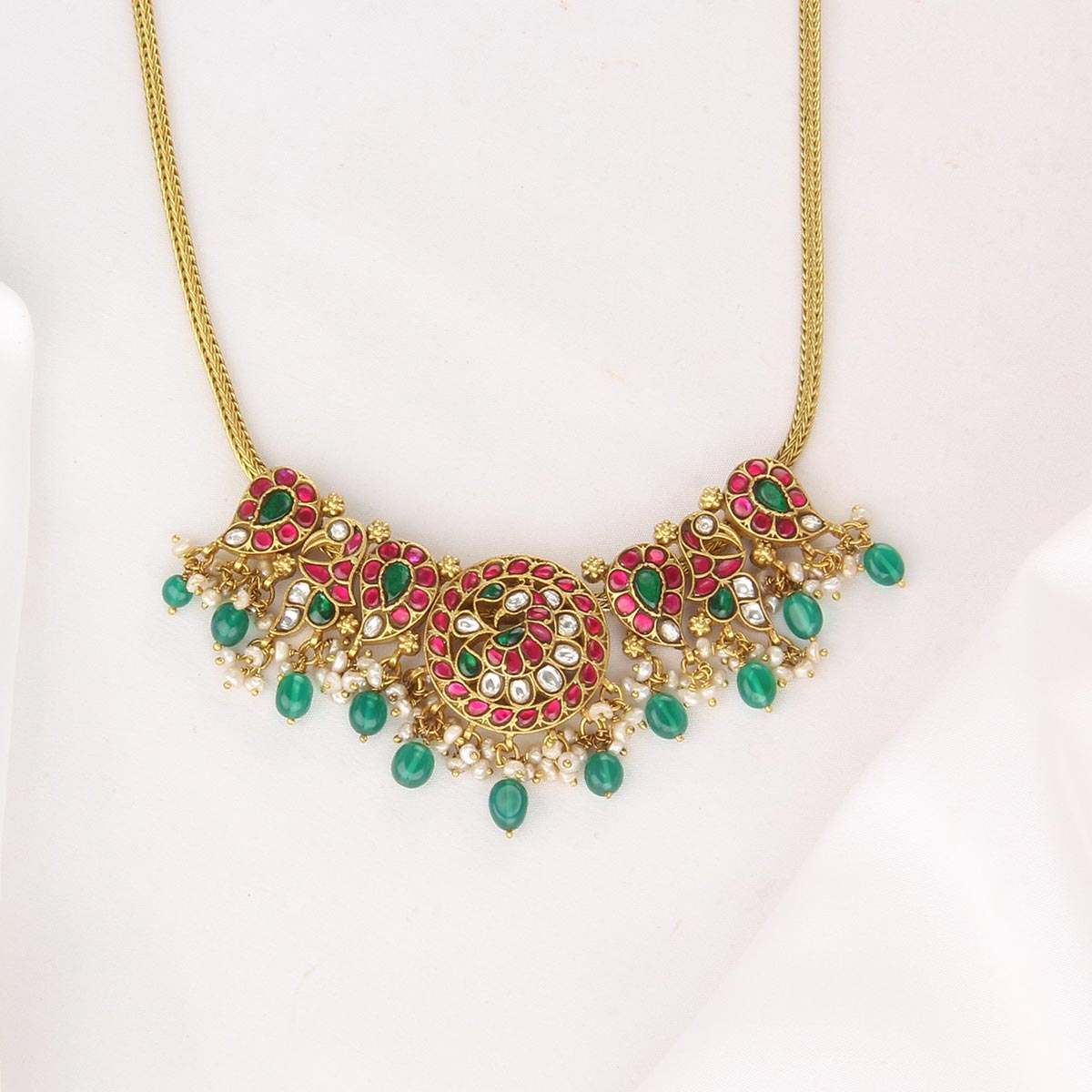 This 92.5 Silver, 24kt gold-plated necklace is adorned with semi-precious kundan stones for a luxurious aesthetic.