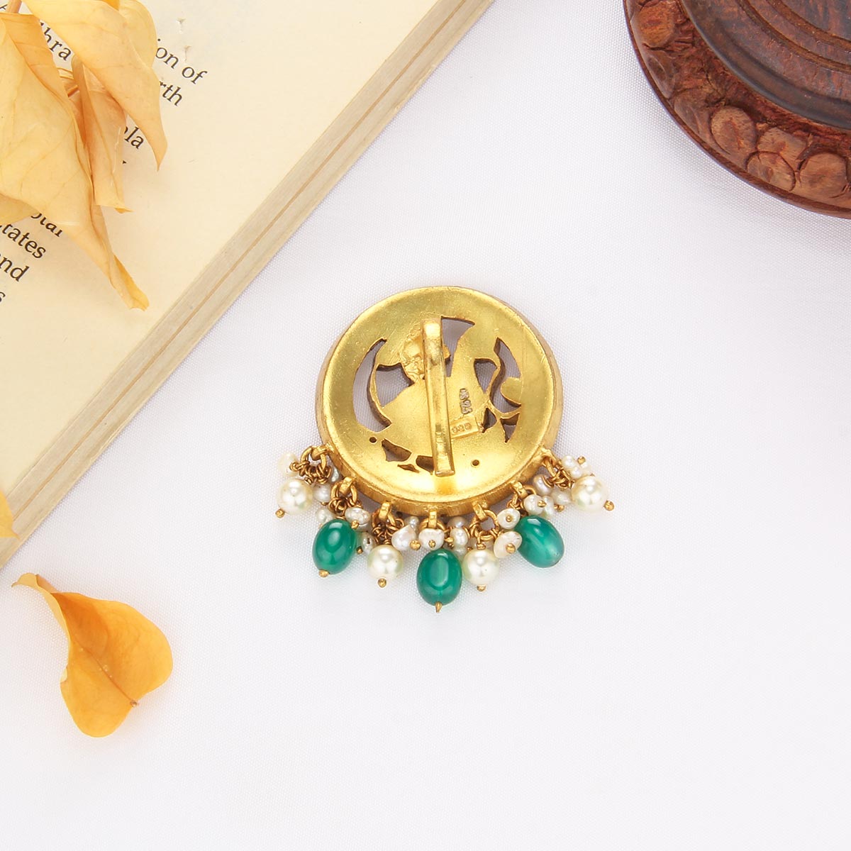 This 92.5 Silver, 24 kt Gold-Plated Pendant is adorned with Semi-precious Kundan Stones for a luxurious aesthetic.