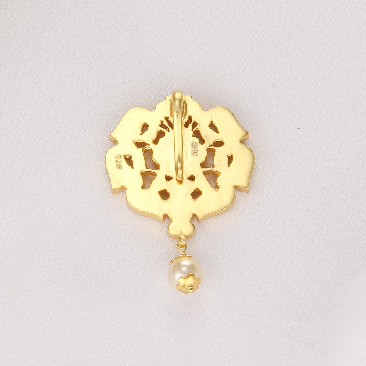 This 92.5 Silver, 24 kt Gold-Plated Pendant is adorned with Semi-precious Kundan Stones for a luxurious aesthetic.