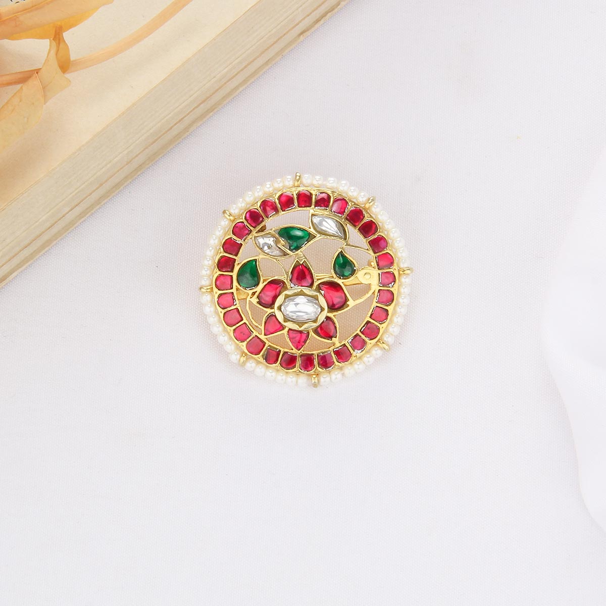 This 92.5 Silver and 24Kt Gold Plated Brooch Pin is embellished with Kundan Stones for an elegant look.